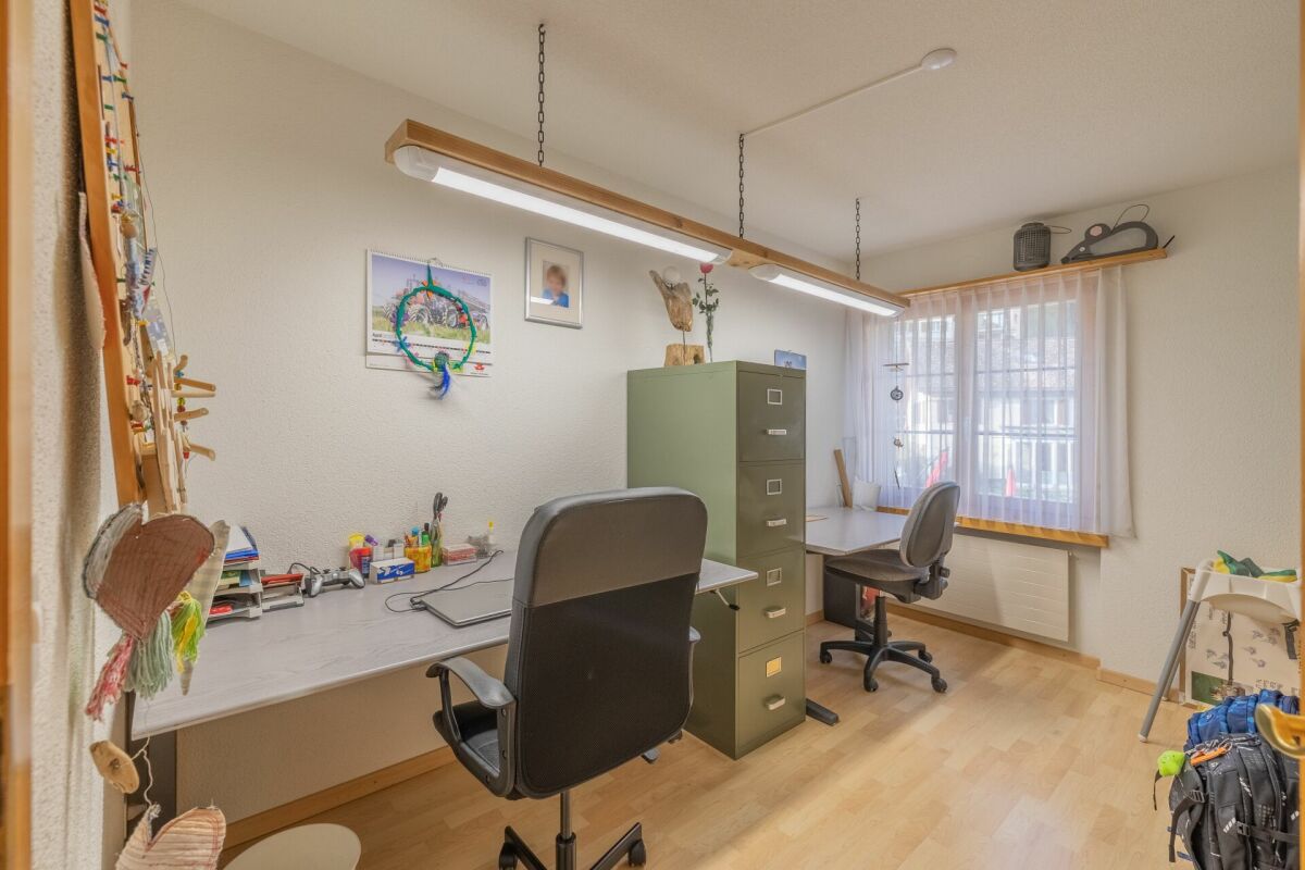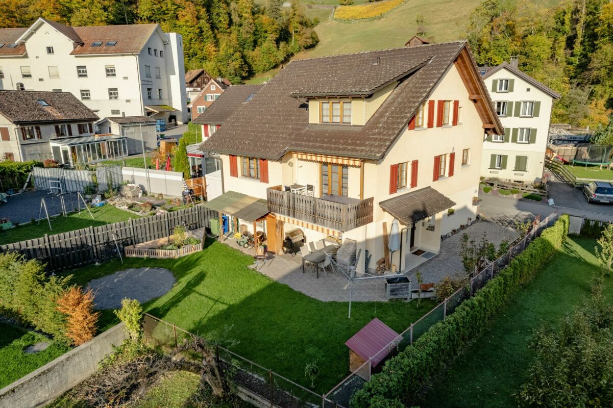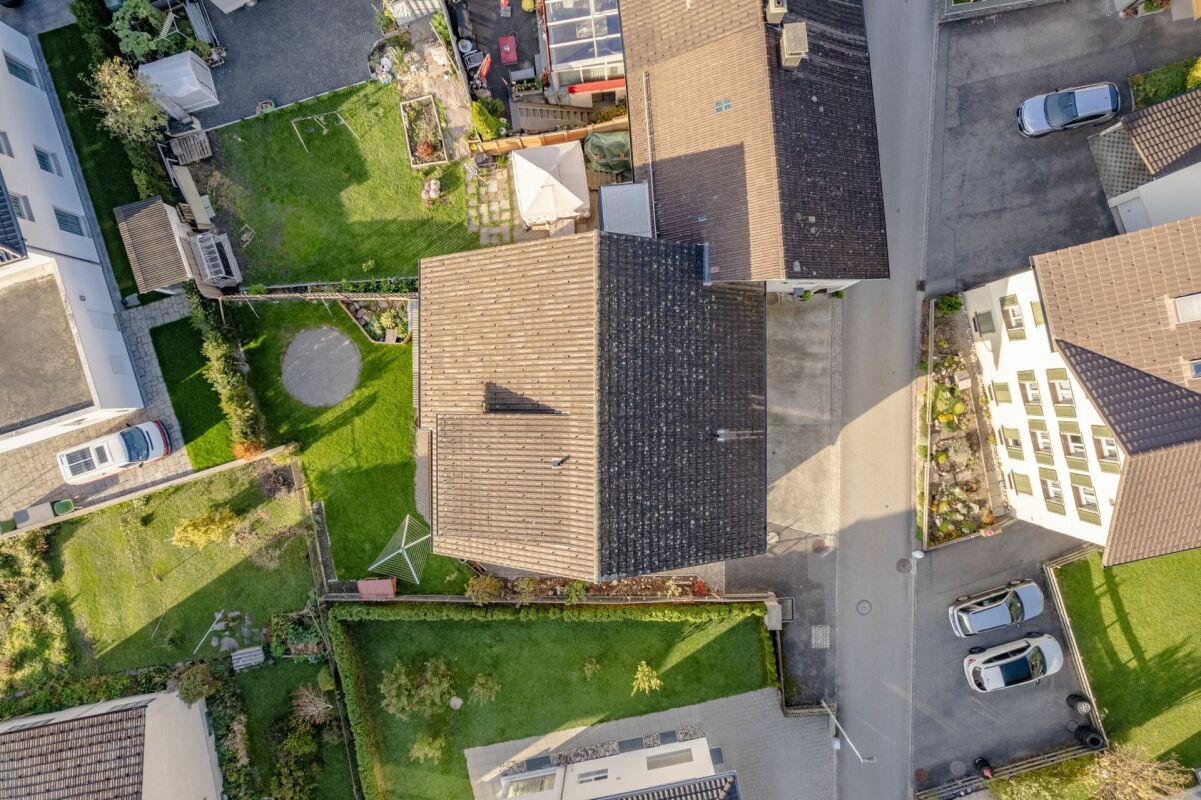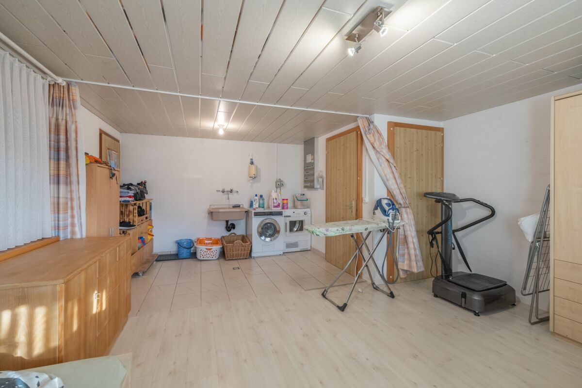 Im Untergeschoss befinden sich die Nebenräumen wie der Luftschutzkeller, der Naturkeller sowie die Heizung. Das Erdgeschoss umfasst die Waschküche, ein Veloraum sowie zwei Garagen. Der Abstellraum im Erdgeschoss wir vom Grundstück Nr. 915 benutzt (Benützungsrecht). Im Obergeschoss ist der grosszügige Wohn-/Essbereich mit direktem Zugang zum Balkon sowie die Küche, zwei Zimmer und ein Badezimmer mit Dusche/WC zu finden. Drei Schlafzimmer sowie das Badezimmer mit Badewanne/WC sind im Dachgeschoss untergebracht. Die zwei Estrich bietet zusätzlichen Stauraum.