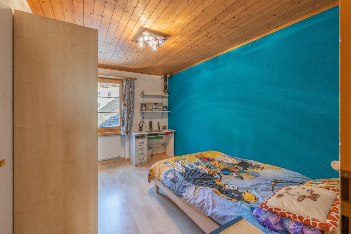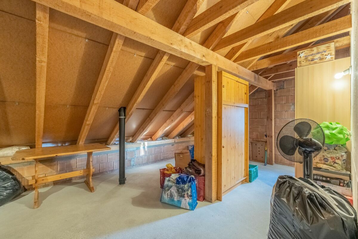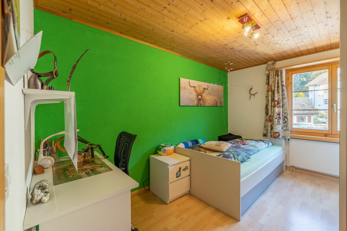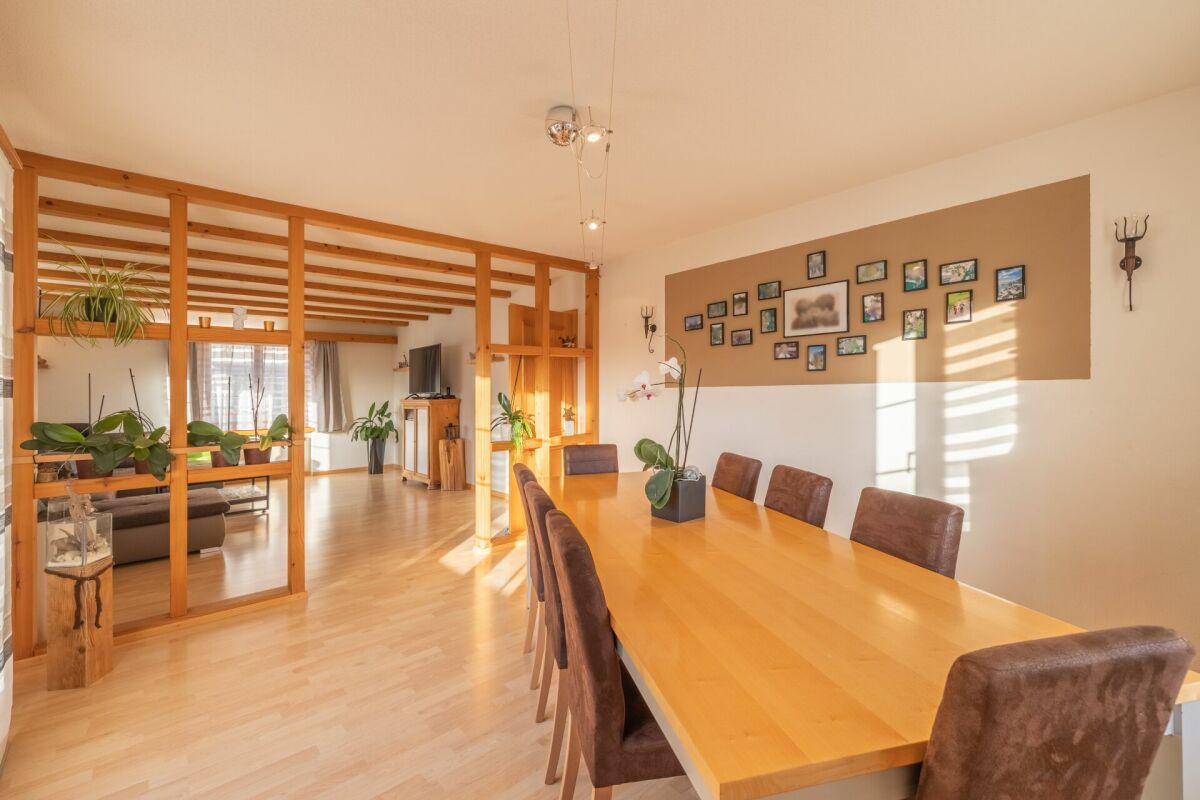 Im Untergeschoss befinden sich die Nebenräumen wie der Luftschutzkeller, der Naturkeller sowie die Heizung. Das Erdgeschoss umfasst die Waschküche, ein Veloraum sowie zwei Garagen. Der Abstellraum im Erdgeschoss wir vom Grundstück Nr. 915 benutzt (Benützungsrecht). Im Obergeschoss ist der grosszügige Wohn-/Essbereich mit direktem Zugang zum Balkon sowie die Küche, zwei Zimmer und ein Badezimmer mit Dusche/WC zu finden. Drei Schlafzimmer sowie das Badezimmer mit Badewanne/WC sind im Dachgeschoss untergebracht. Die zwei Estrich bietet zusätzlichen Stauraum.