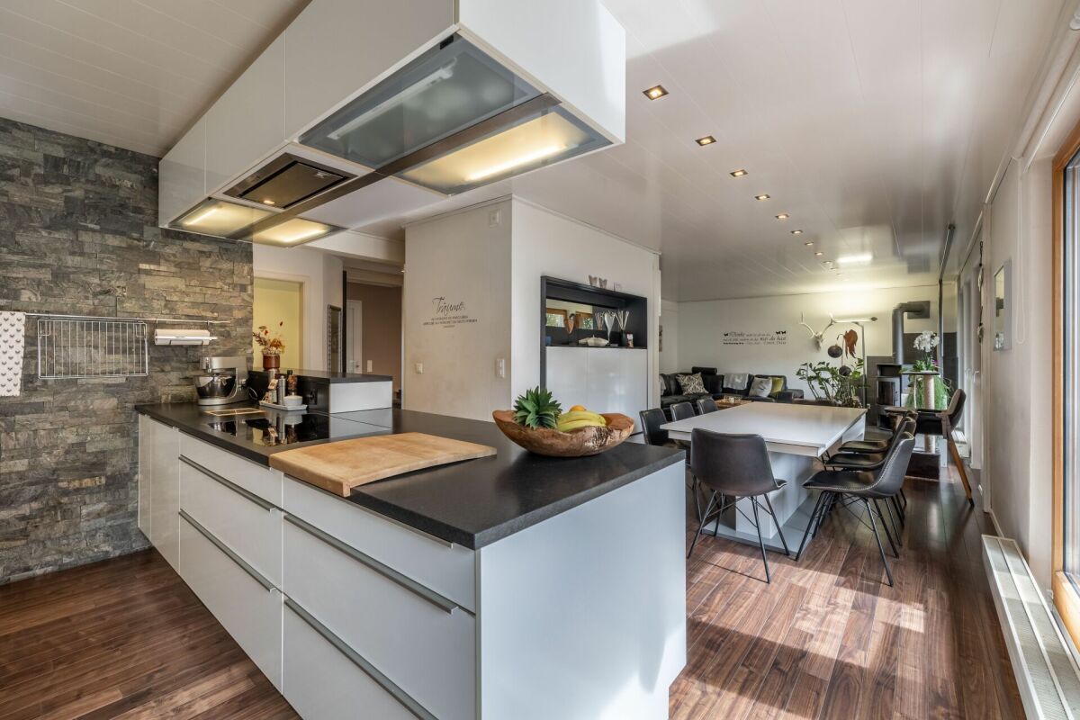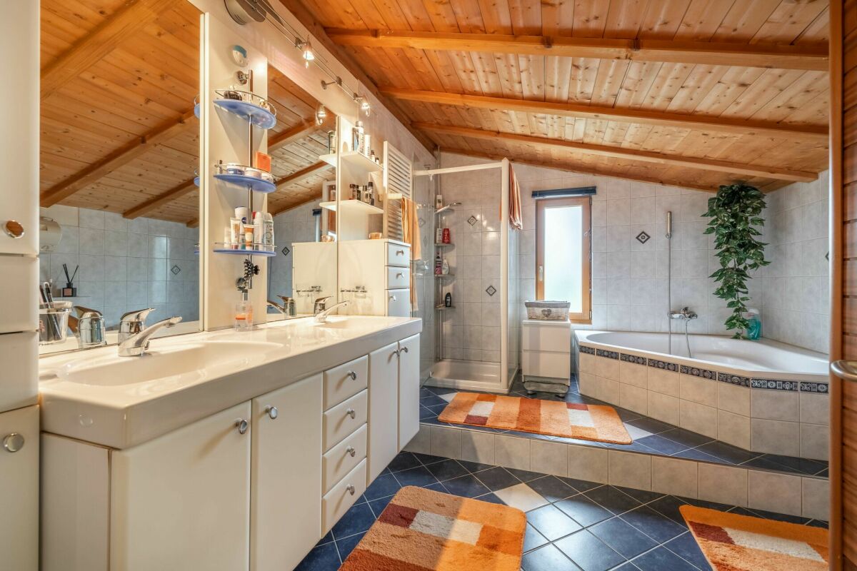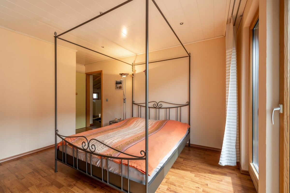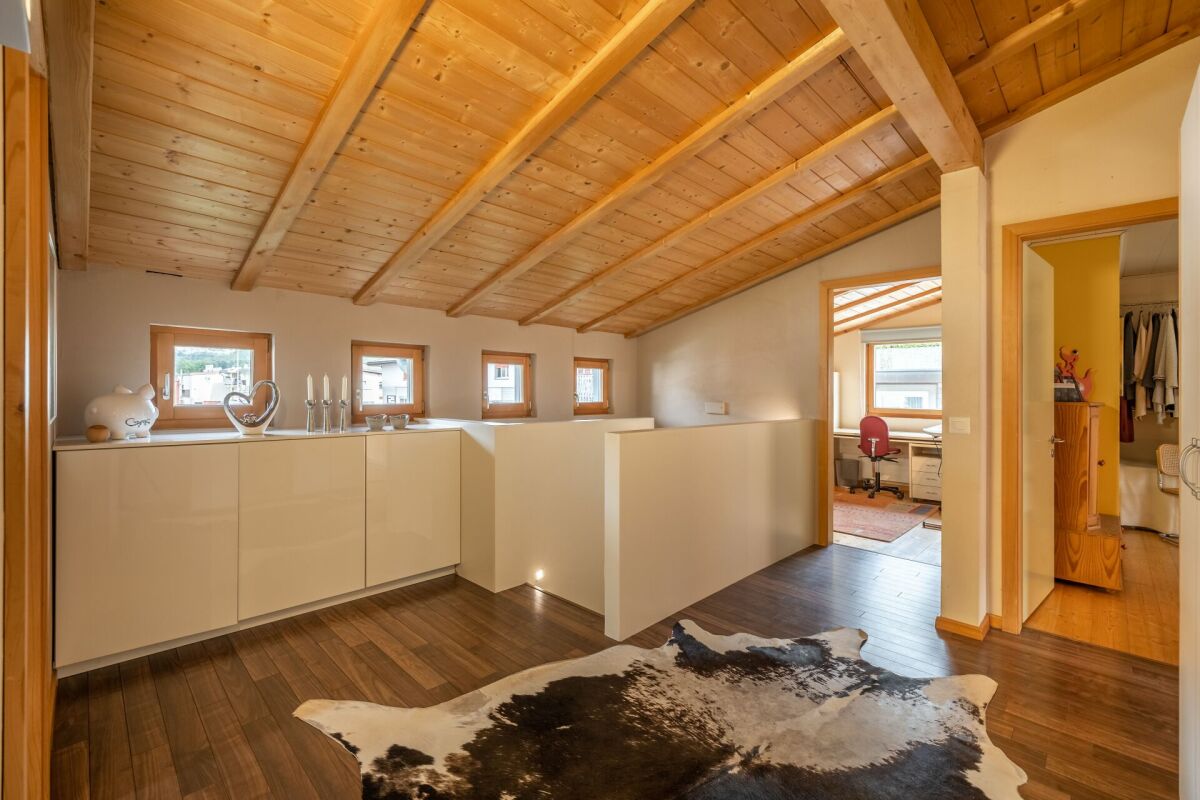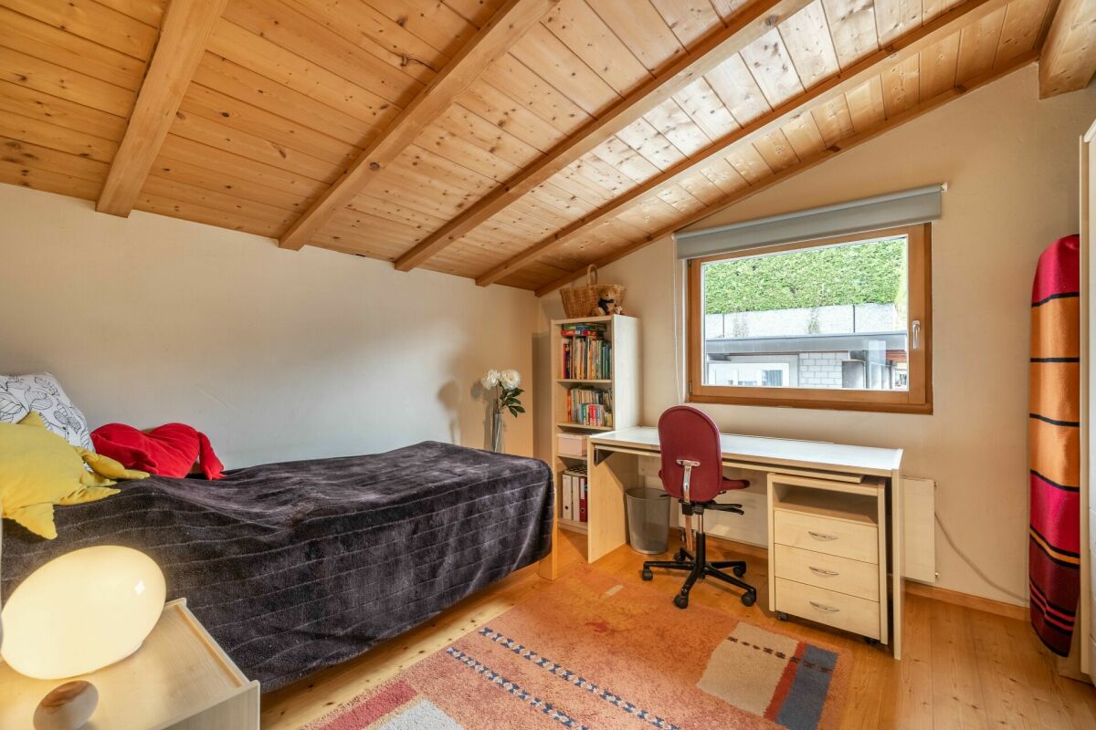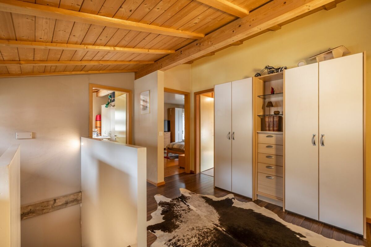 Im Erdgeschoss verspricht die offene Küche mit Ess- und Wohnbereich viel Platz zum Kochen und Entspannen. Der Schwedenofen im Wohnzimmer sorgt für gemütliche Stunden. Dazu bietet die Speisekammer zusätzlichen Raum zur Aufbewahrung von Lebensmitteln. Dank raumhohen Fenstern sind die Lichtverhältnisse optimal. Der Heizungsraum, das Büro und das Badezimmer mit Dusche/WC vervollständigen diese Wohnebene. Drei Schlafzimmer sorgen im Obergeschoss für Rückzugsmöglichkeiten und ein Büro bietet Platz zum arbeiten. Das Hauptbadezimmer mit Dusche und Eckbadewanne runden das Raumprogramm ab. Geniessen Sie dazu entspannte Minuten in der Sauna, welche sich ebenfalls im grosszügigen Badezimmer befindet.