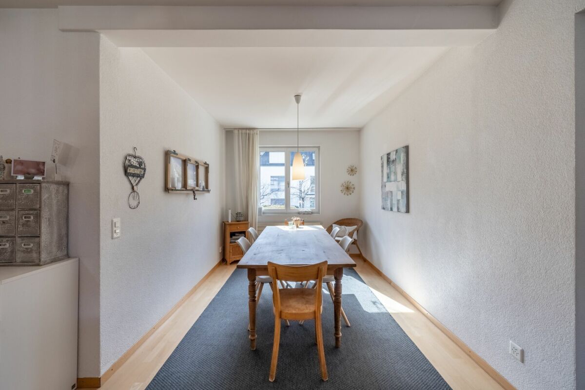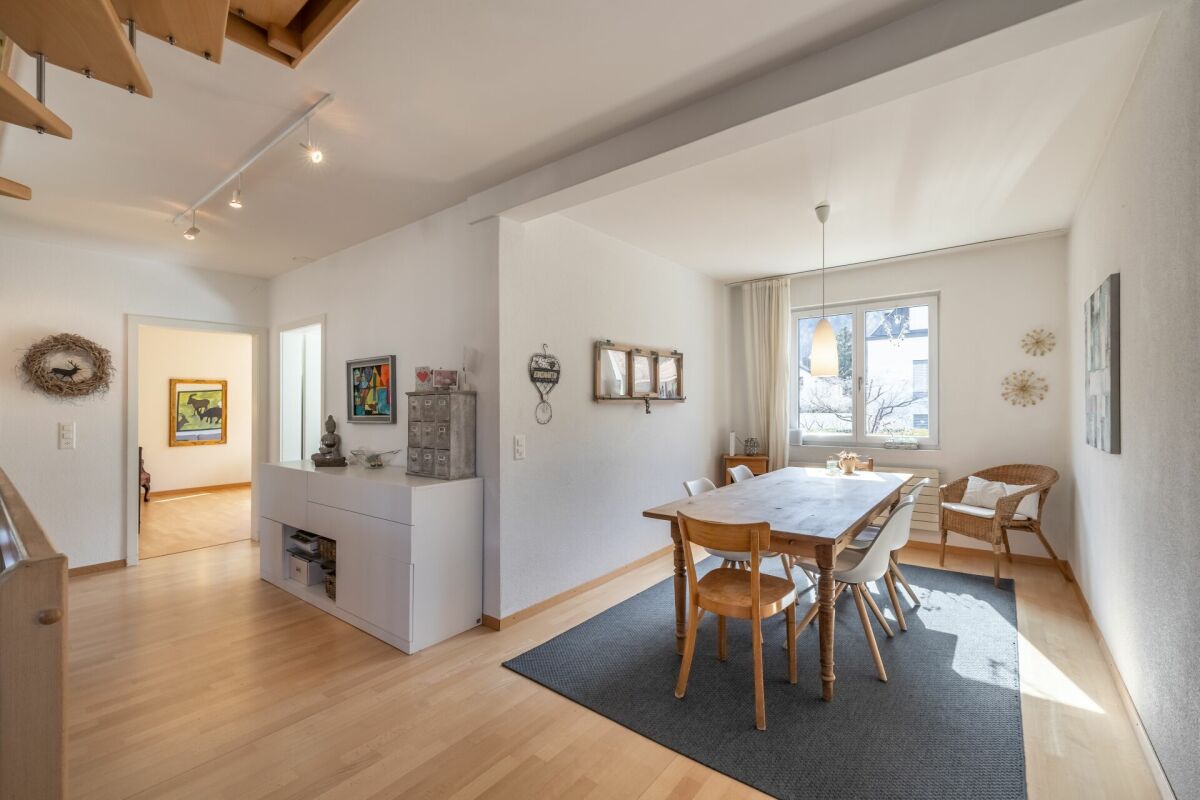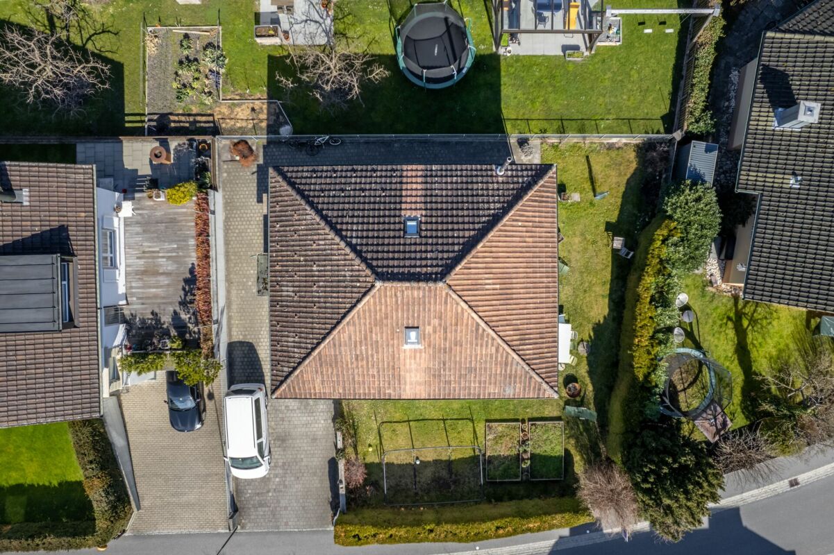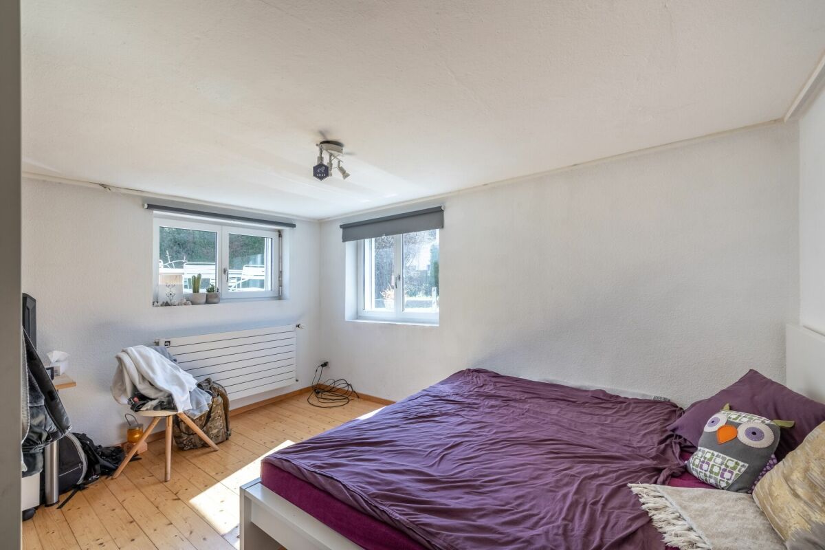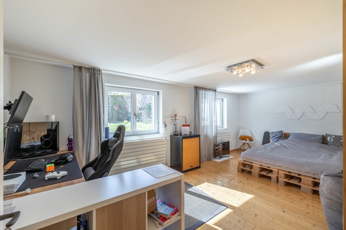 Das Entrée eröffnet sich in den Koch-Essbereich mit Blick auf das gemütliche Wohnzimmer. Zwei Schlafzimmer und ein Badezimmer mit Badewanne runden das Raumprogramm im Erdgeschoss ab. Im Untergeschoss (parterre souterrain) sind zwei weitere Schlafzimmer und ein Badzimmer mit Dusche/WC untergebracht. Im Jahr 2002 wurde das Dach aufgestockt sowie ausgebaut. Dieses Geschoss bietet mit einer Fläche von rund 36 m² genügend Raum für Ihren individuellen Bedarf wie z.B. Homeoffice. Im gleichen Jahr wurde die Liegenschaft umfassend saniert, wie zum Beispiel Küche, Badezimmer, Heizung, usw.