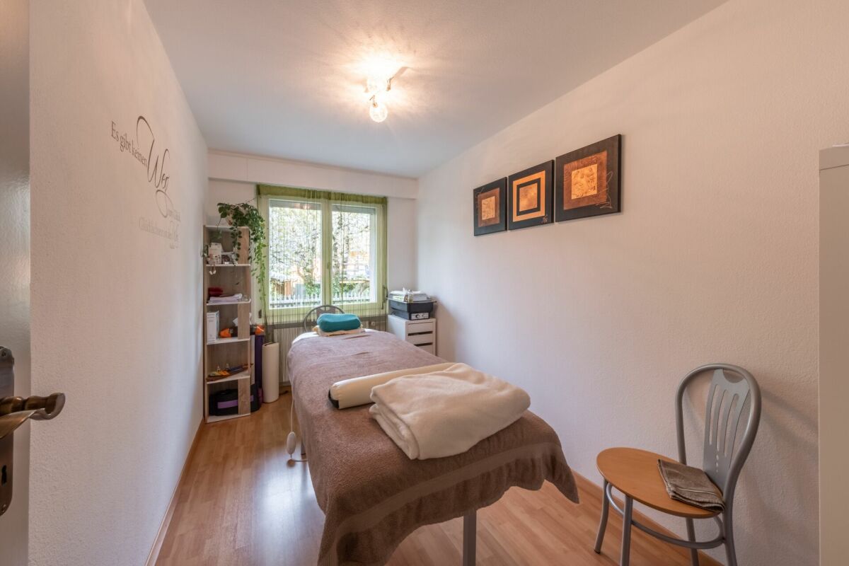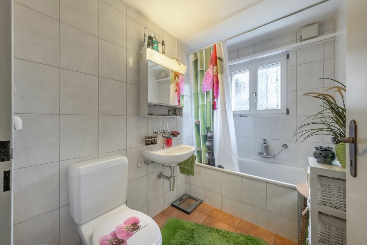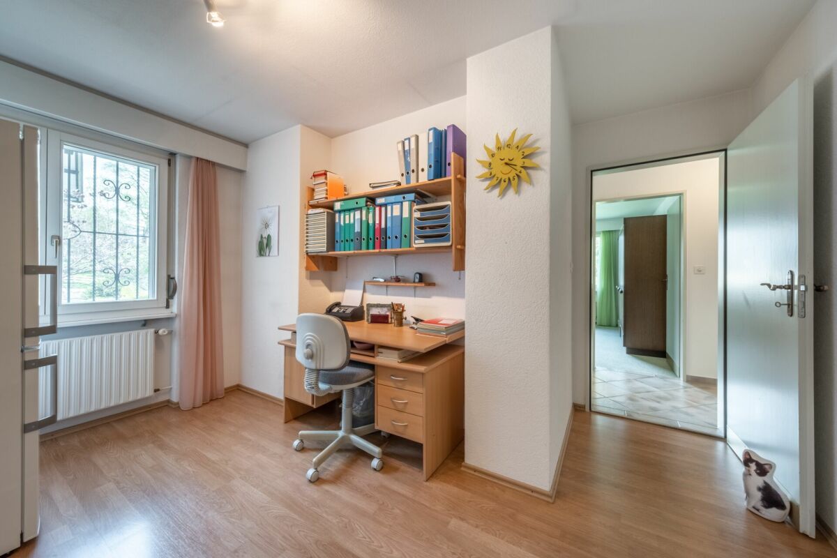 Die drei Zimmer versprechen Rückzugsmöglichkeiten und Platz zur Erholung. Über das Wohnzimmer gelangen Sie direkt auf den Balkon, auf welchem Sie Aussicht und Ruhe geniessen können. Das Büro, ein Badezimmer, ein Gäste-WC und die Küche mit offenem Essbereich komplettieren das Angebot.