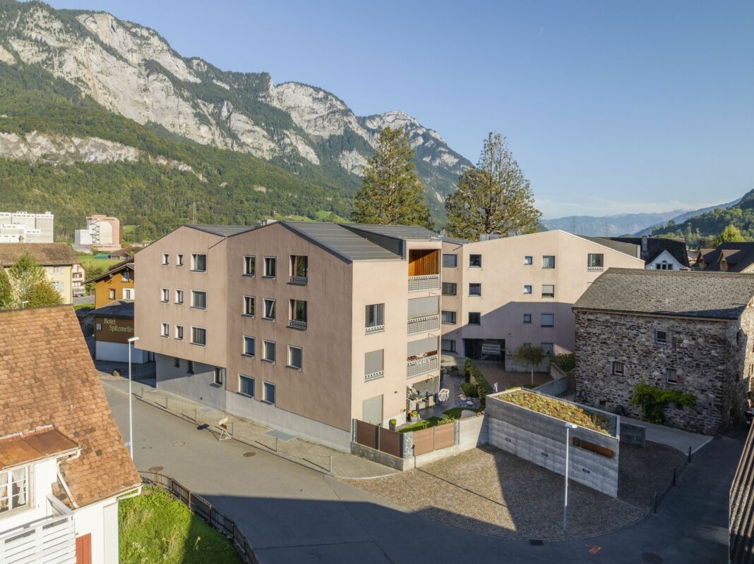 Die Verwendung der Baumaterialien, in Anlehnung an die umliegenden historischen Bauten, trägt dazu bei, dass sich die Überbauung wie selbstverständlich in das bestehende Bebauungsgefüge integriert.