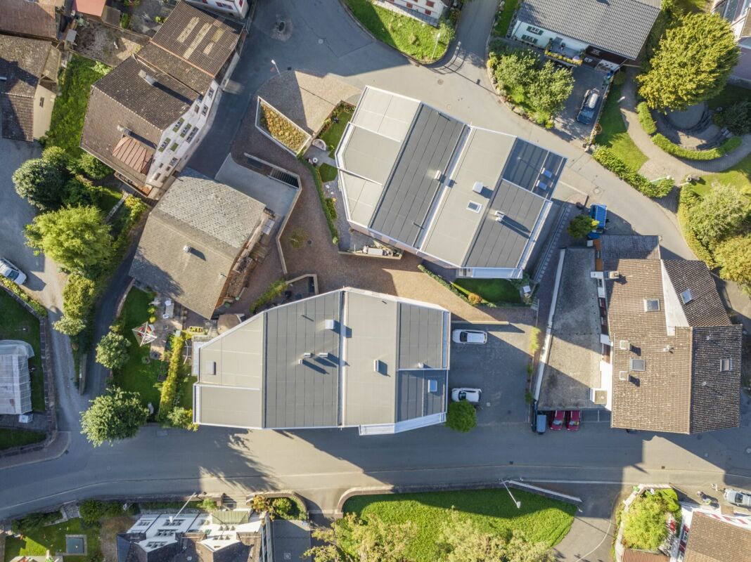 Zusammen mit der Faltung der Fassaden und den geneigten Dachflächen wird eine interessante, moderne Bauform erreicht, die sich gut in die historische Dorfkernstruktur einfügt.