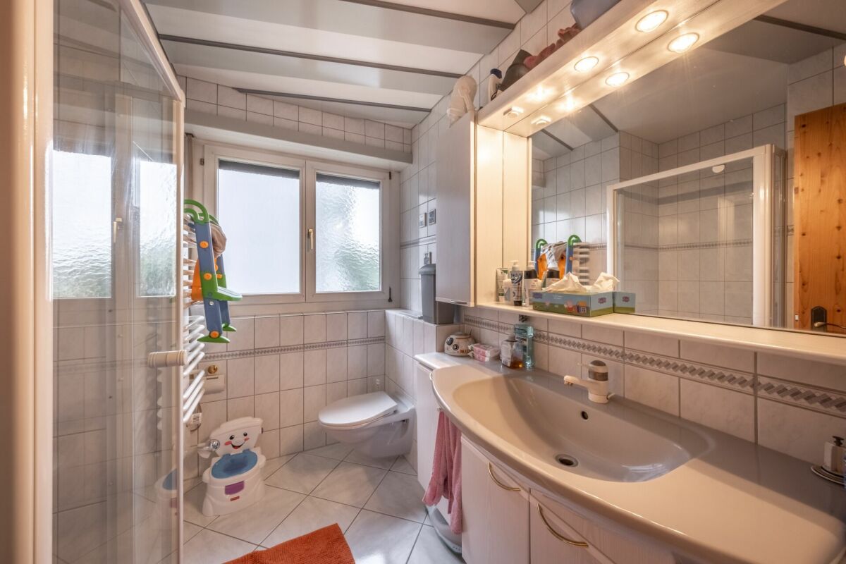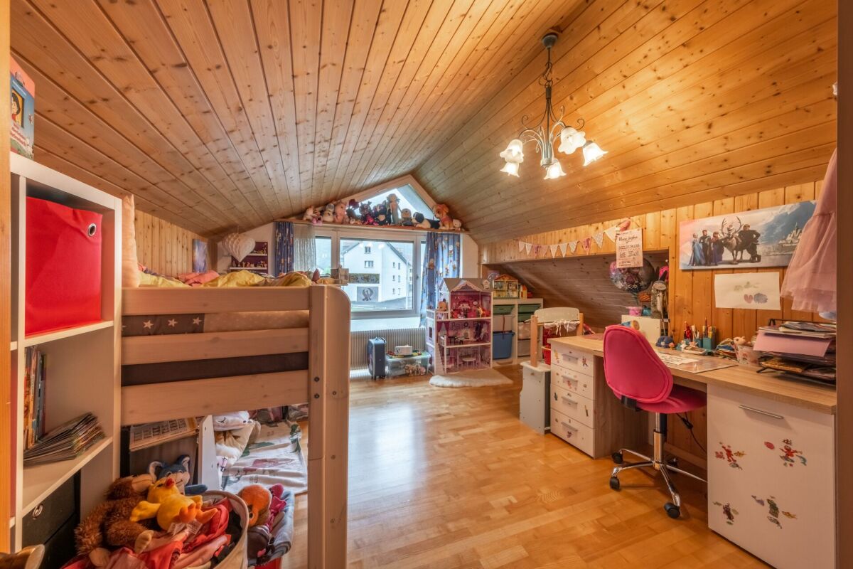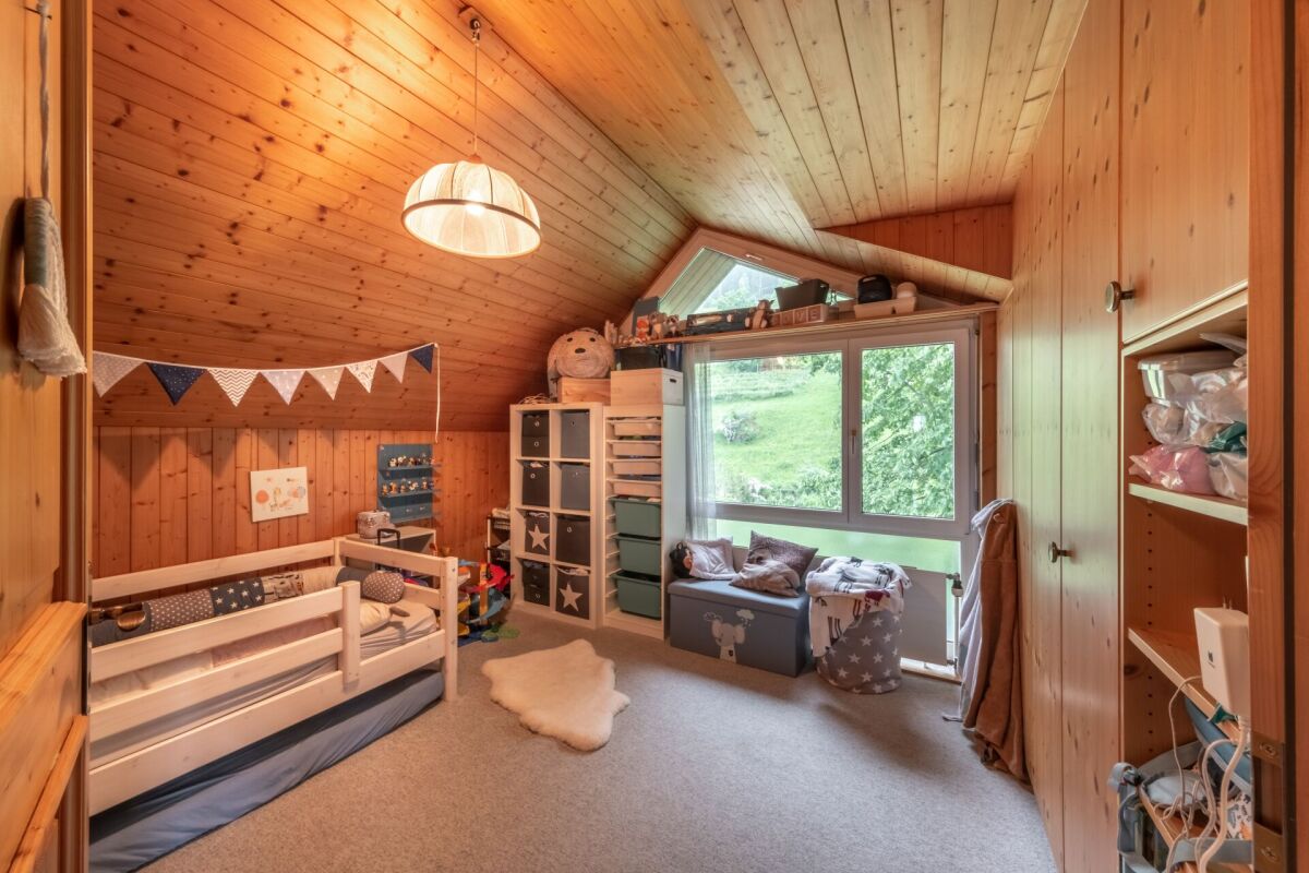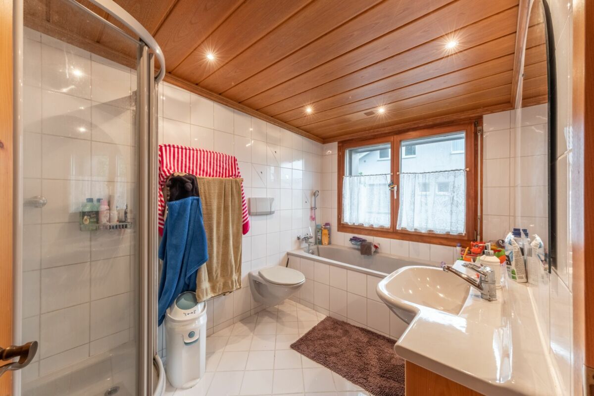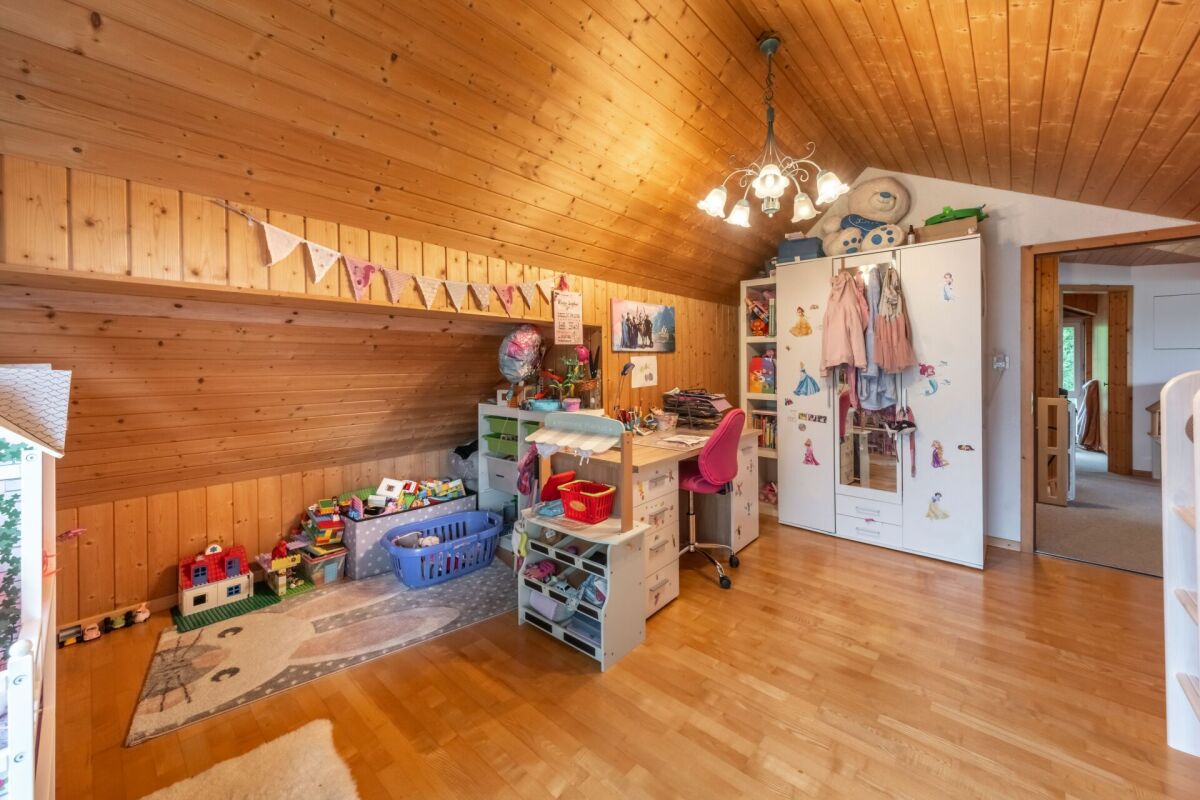 Das Obergeschoss umfasst zwei weitere Zimmer, Badezimmer mit Badewanne/Dusche/WC und einen geräumigen Gang, welcher gut als Büro genutzt werden kann. Stauraum bietet der Estrich im Obergeschoss und der Naturkeller sowie Waschküche im Untergeschoss.