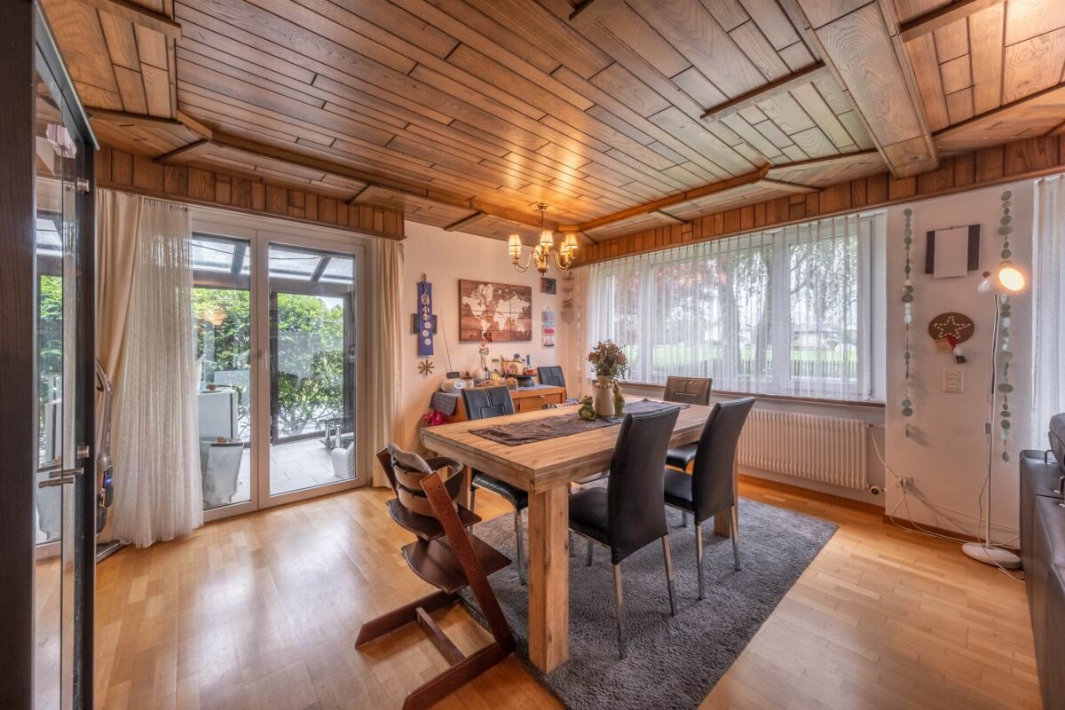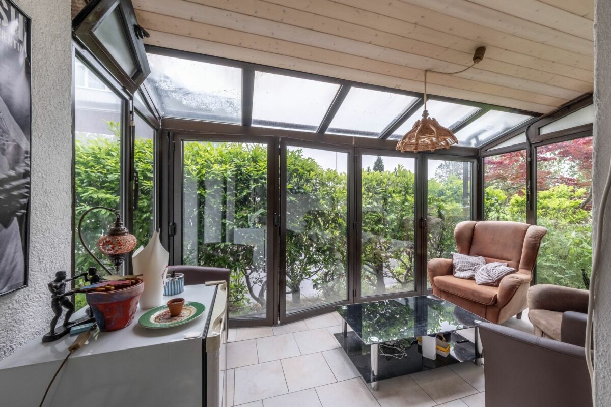 Der grosszügige Wohn- und Essbereich ist der perfekte Ort, um gemeinsame Zeit mit Ihren Liebsten zu verbringen. Hier können Sie entspannen, Ihre Gäste empfangen und unvergessliche Momente schaffen. Der beheizte Wintergarten ist ein weiteres Highlight dieses Hauses und bietet Ihnen die Möglichkeit, die Natur zu jeder Jahreszeit zu geniessen. Auf der gleichen Etage im Erdgeschoss befinden sich die Küche, Badezimmer mit Dusche/WC und zwei Zimmer.