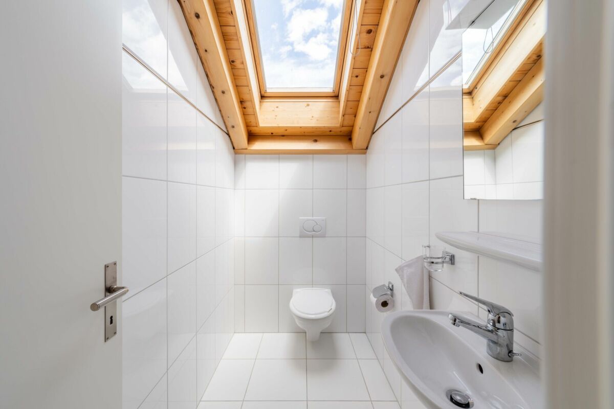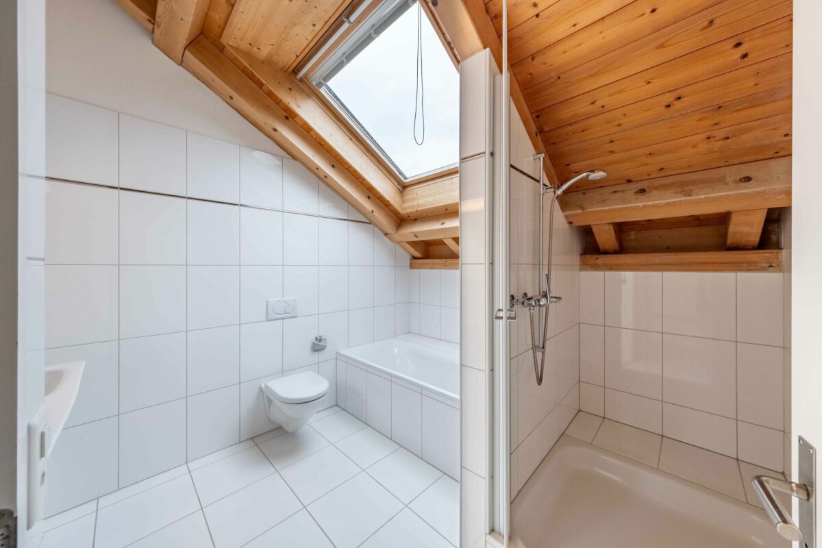 Ein elegantes Badezimmer mit Badewanne und Dusche sowie ein separates Gäste-WC runden das Raumangebot ab. Die Wohnung ist dank Lift bequem und barrierefrei erreichbar.