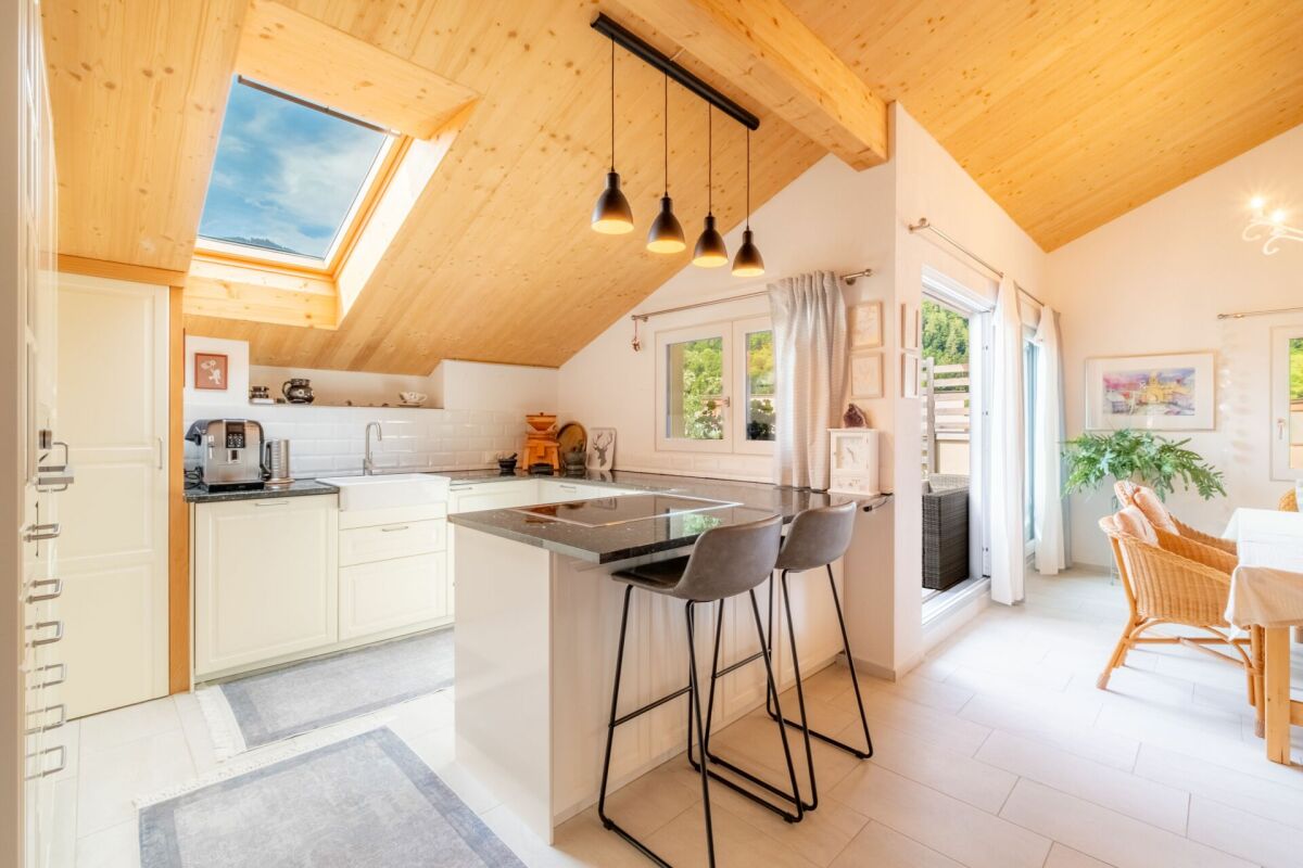 Der grosszügige Wohn-, Koch- und Essbereich ist offen gestaltet und überzeugt mit grossen Fensterflächen, welche viel Tageslicht ins Innere bringen. Die moderne Küche überzeugt mit einem grosszügigen Kochfeld von 80 cm sowie einem Backofen mit integrierter Steamer-Funktion. Ein extra grosser Kühlschrank mit No-Frost-Technologie bietet reichlich Platz für frische Lebensmittel. Zusätzlich steht ein praktischer Reduit-Raum zur Aufbewahrung von Vorräten zur Verfügung. Vom Essbereich aus gelangen Sie direkt auf die sonnige Terrasse, welche mit einem herrlichen Panoramablick punktet – der ideale Ort, um entspannte Stunden im Freien zu geniessen.