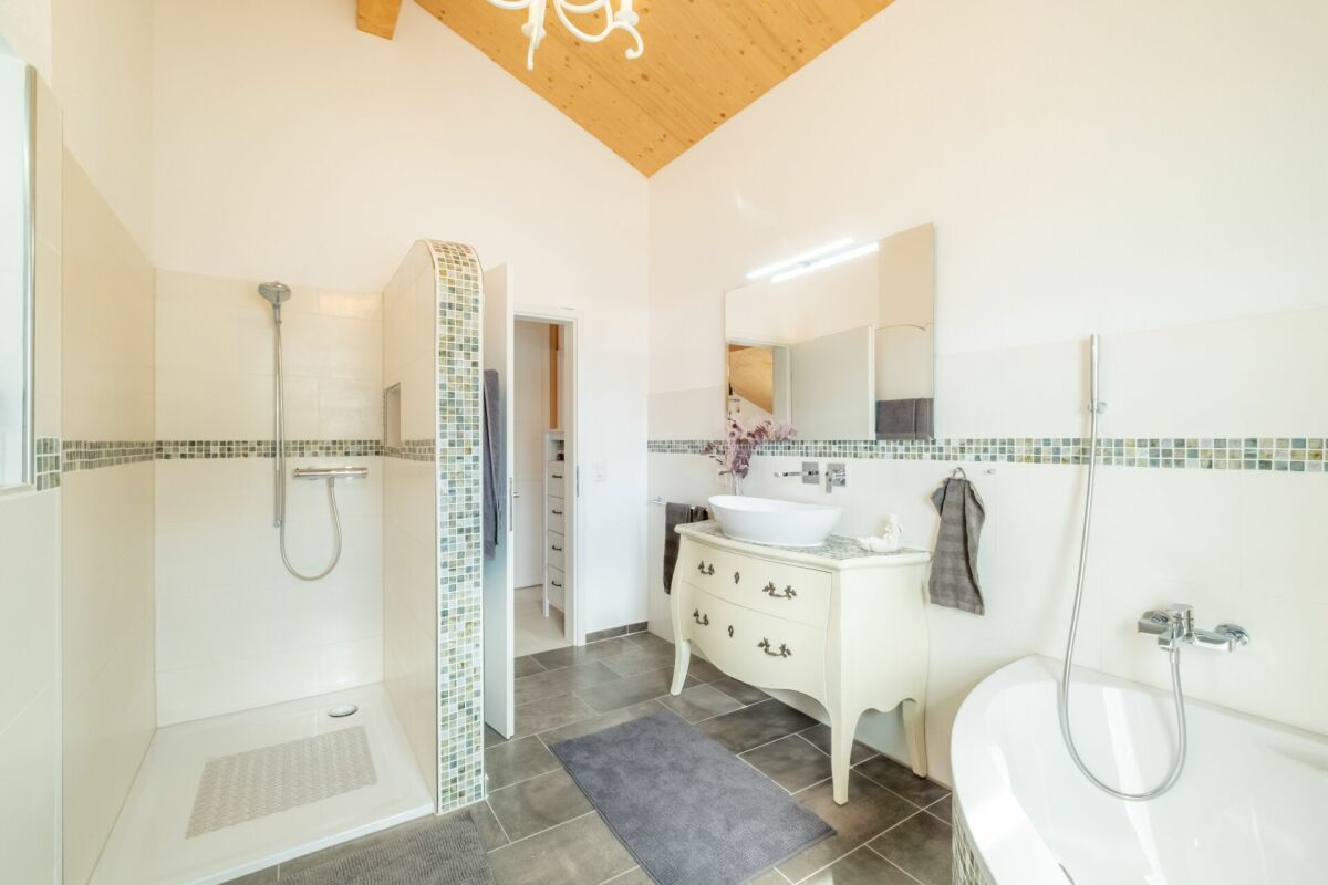 Das Badezimmer ist hochwertig ausgestattet und verfügt über eine bodenebene Dusche sowie eine gemütliche Eckbadewanne. Zwei gut proportionierte Schlafzimmer bieten Platz für individuelle Wohnbedürfnisse, sei es als Schlafzimmer, Büro oder Gästezimmer.