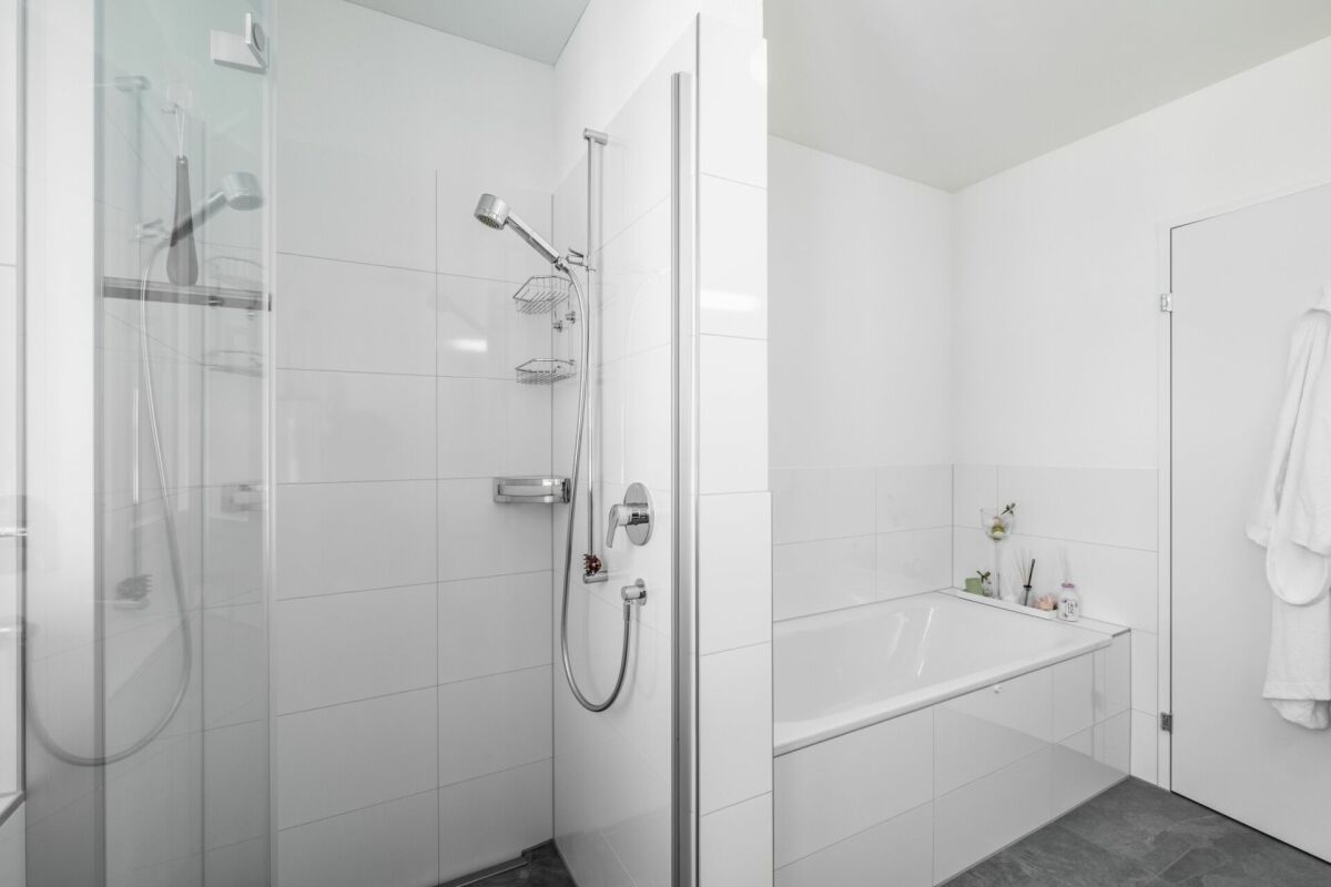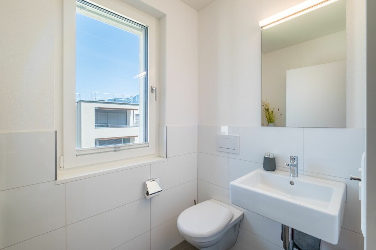 Die Wohnung verfügt über ein grosszügiges Badezimmer mit Tageslicht sowie ein separates WC. Eine eigene Waschmaschine und ein Tumbler befinden sich direkt in der Wohnung und bieten zusätzlichen Komfort.