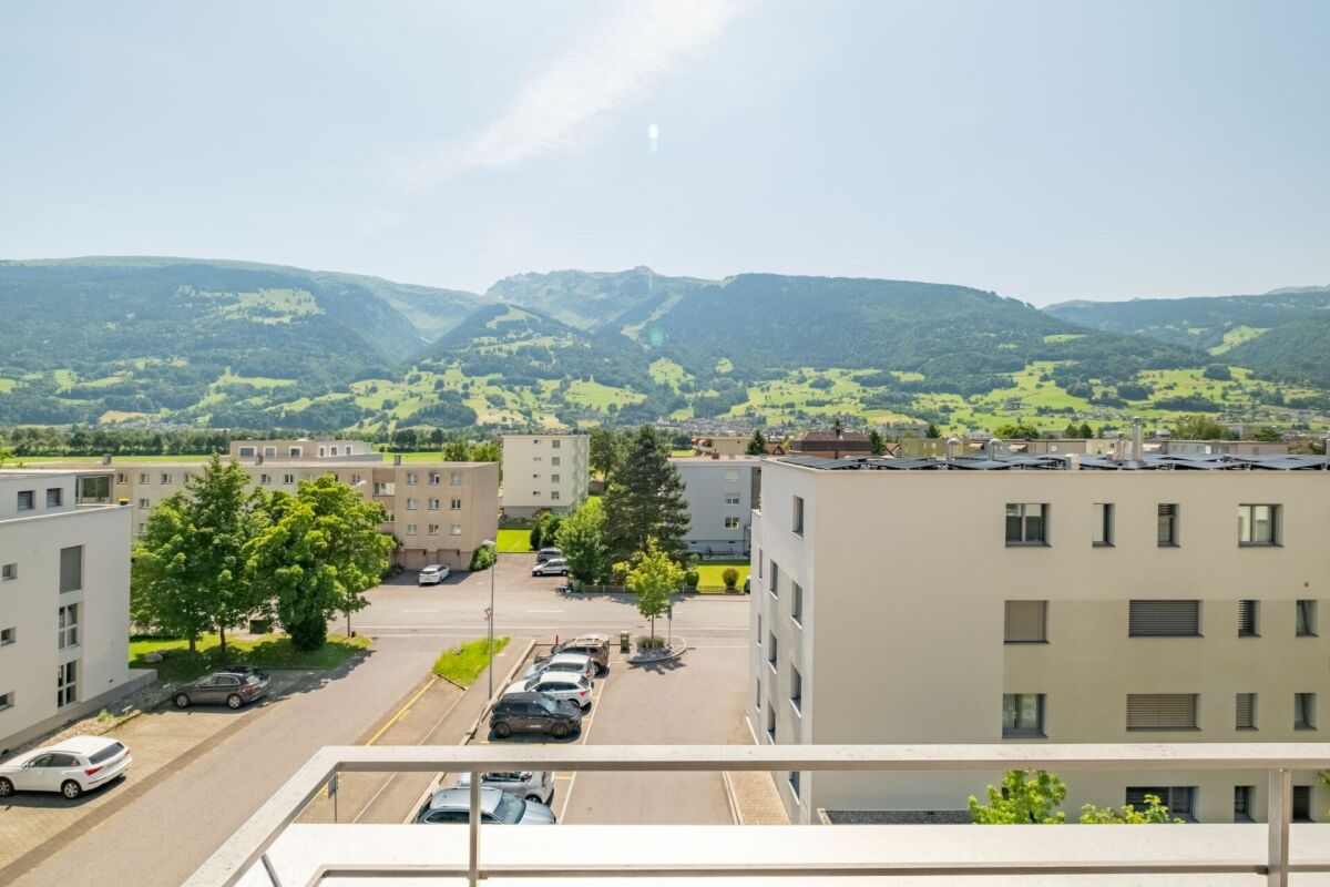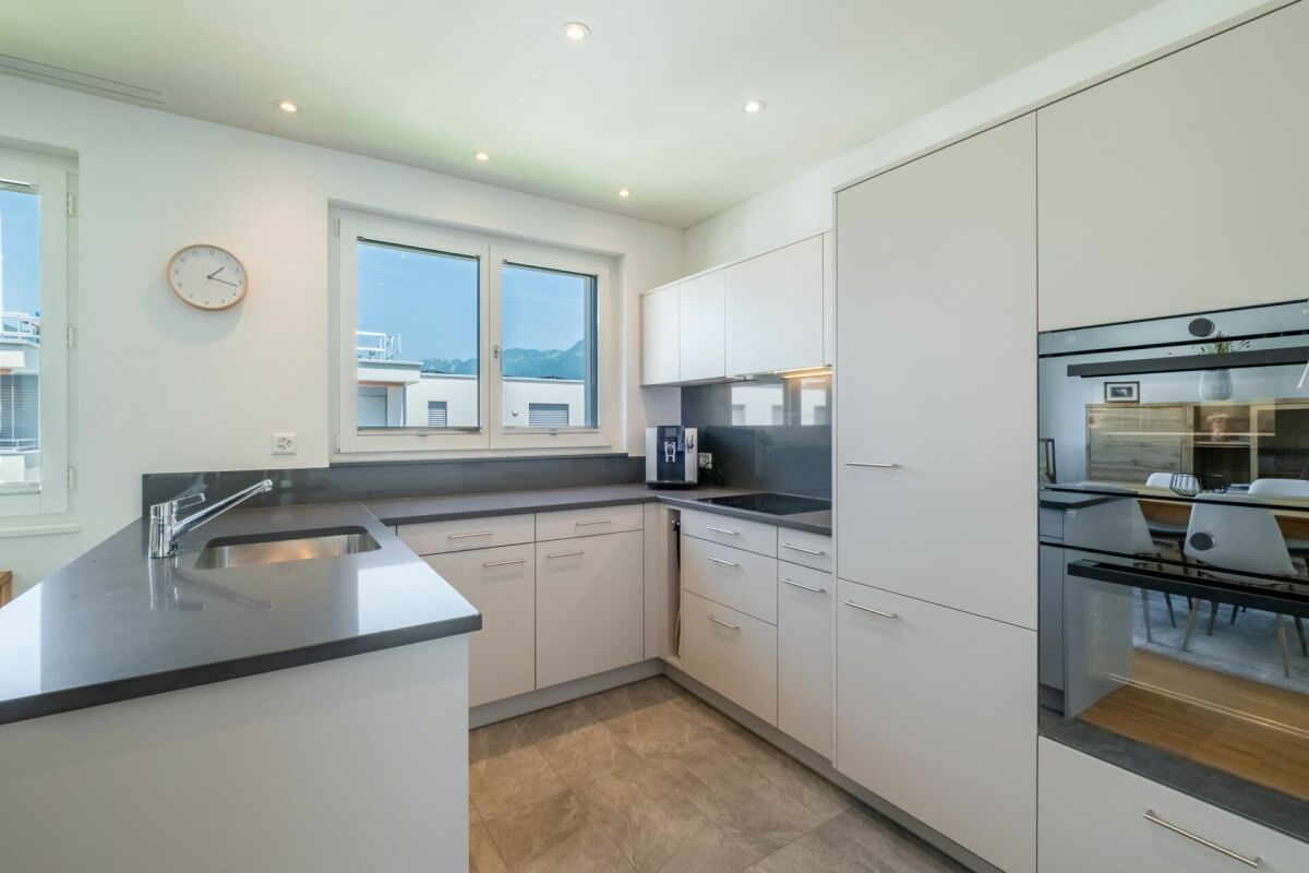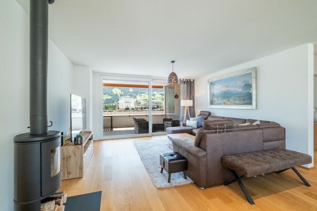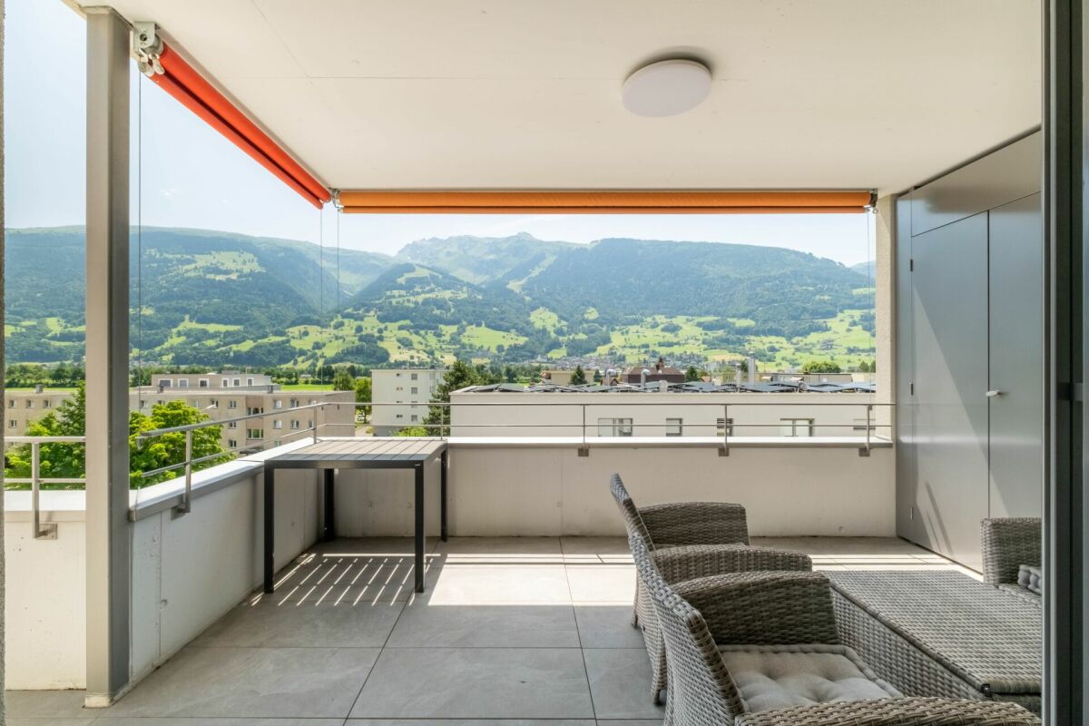 Ein besonderes Highlight ist die grosszügige Terrasse mit offenem und gedecktem Bereich – perfekt für sonnige Stunden, entspannte Abende oder gesellige Anlässe mit beeindruckendem Ausblick über die Dächer der Umgebung bis hin zum imposanten Bergpanorama.