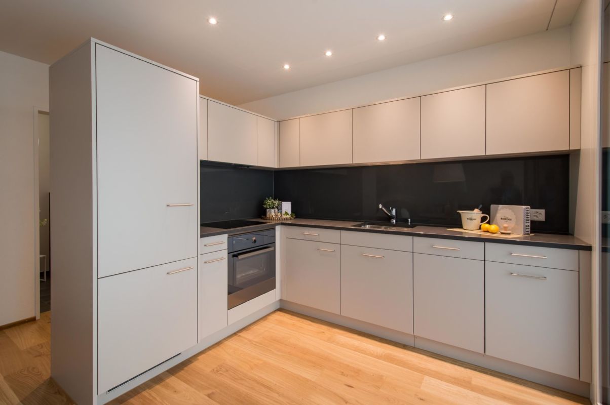 Küche mit Glaskeramikkochfeld, Kombi-Steamer, Geschirrspüler, Kühlschrank, Gefrierschrank