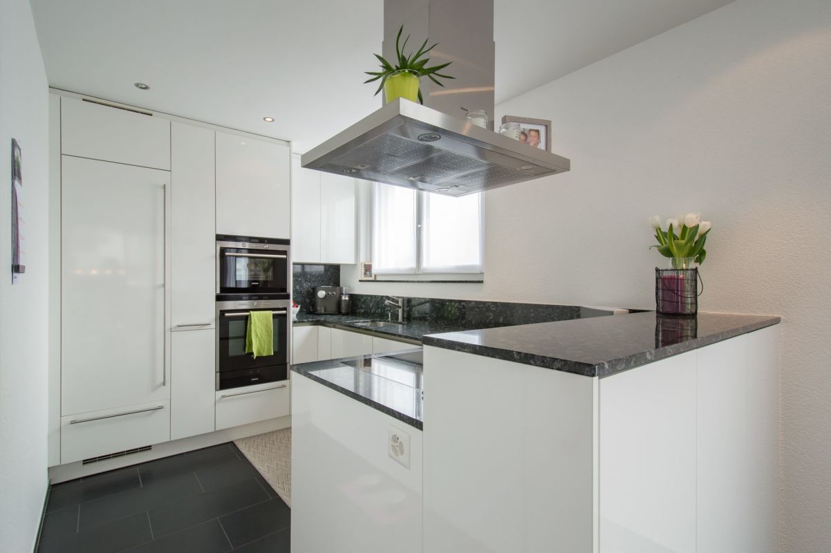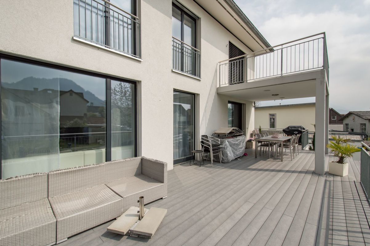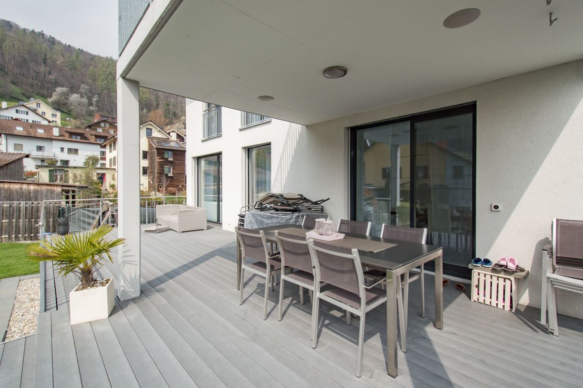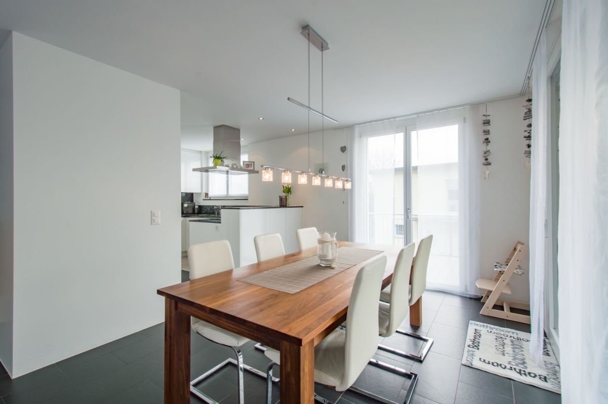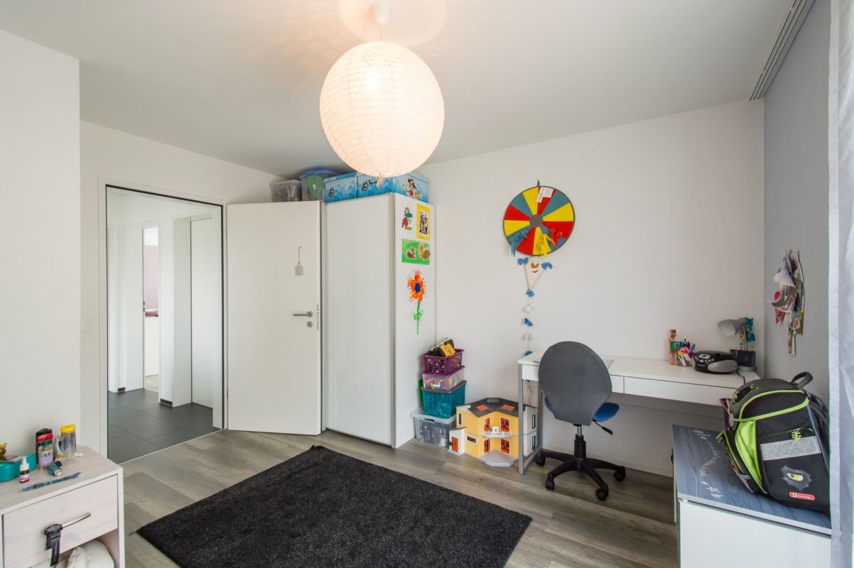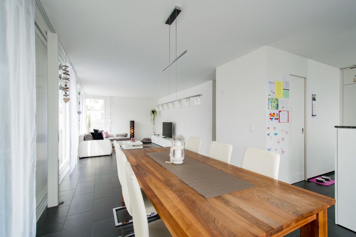 Auf der Ebene 1 befinden sich eine moderne Küche mit praktischer Spensa sowie ein offener Ess- und Wohnbereich, welcher dank grosszügigen Fensterfronten (3-fach Verglasung) lichtdurchflutet ist. Ein separates WC sowie ein Zimmer befinden sich ebenfalls auf diesem Stockwerk. Vom Ess- und Wohnbereich gelangen Sie auf die nach Süden ausgerichtete Terrasse mit über 60 m2 und Zugang zum Garten. Auf der Terrasse befindet sich der gedeckte Sitzplatz mit integrierten Deckenlautsprecher, welche z.B. über Sonos angesteuert werden können.