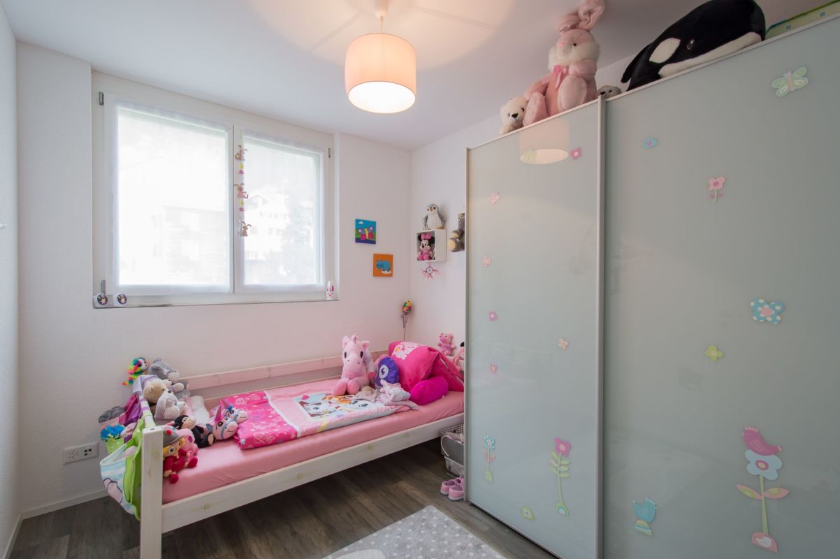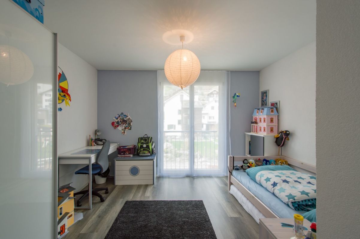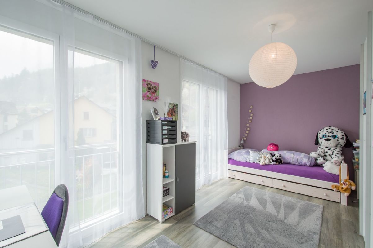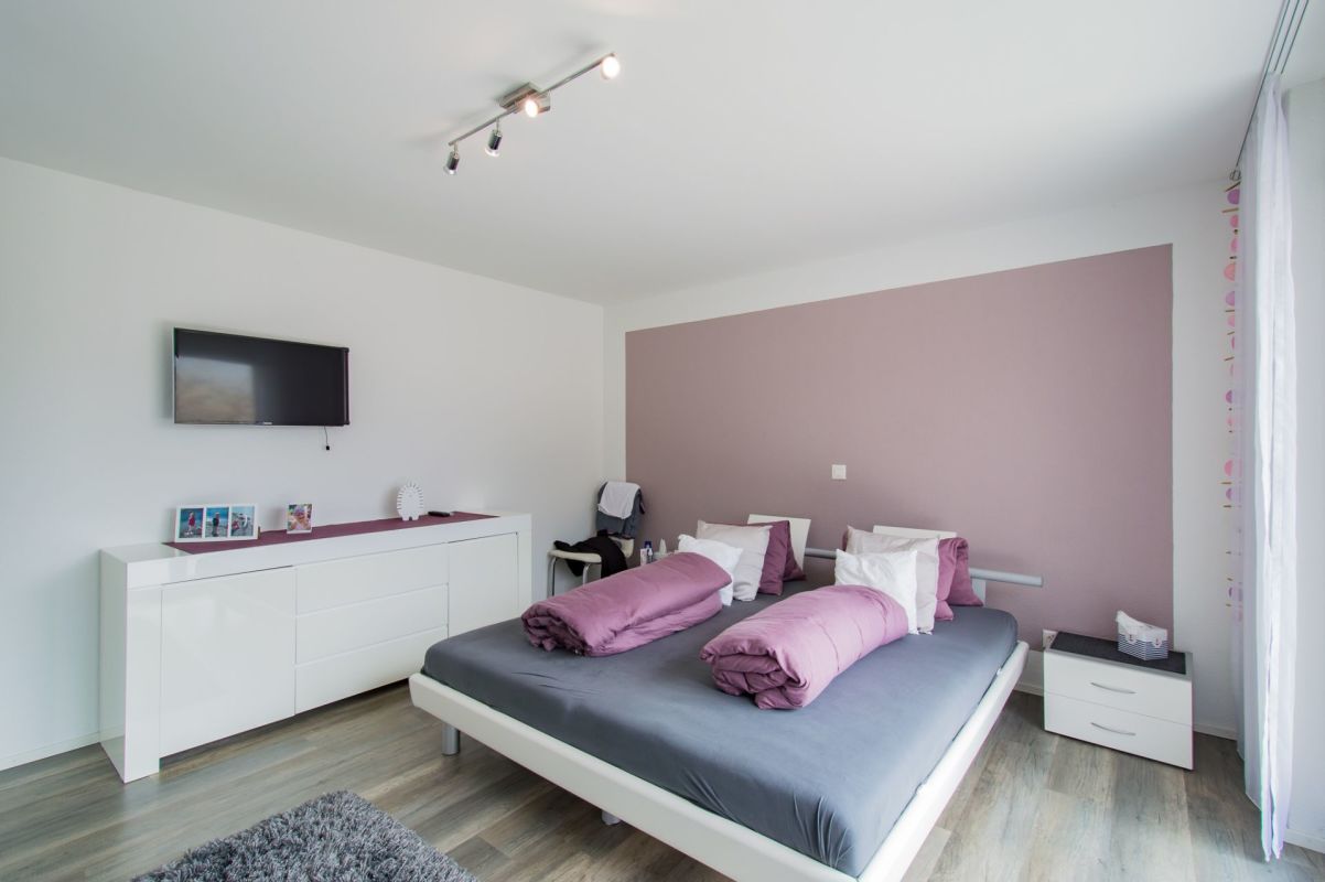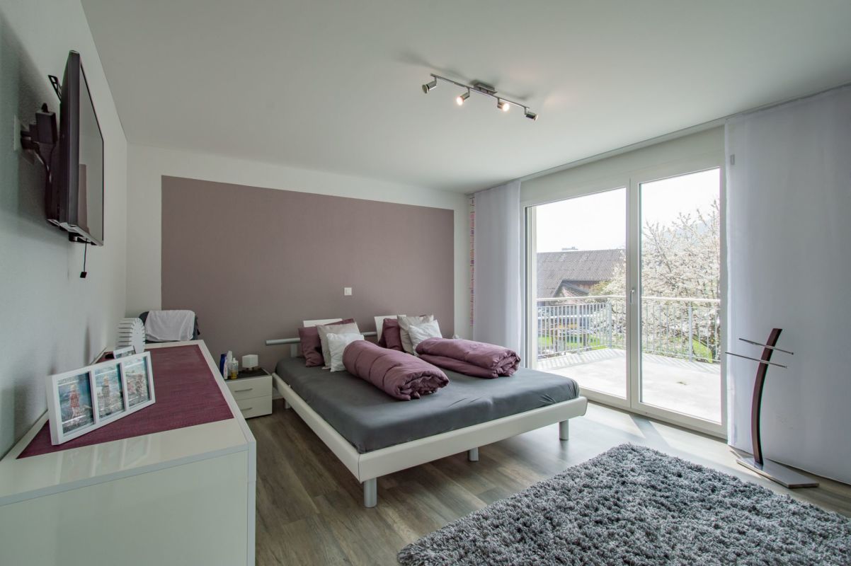Das Obergeschoss resp. die Ebene 2 verfügt über drei Schlafzimmer und ein grosszügiges Badezimmer mit Dusche und Doppelwaschtisch. Über das Elternschlafzimmer gelangen Sie auf einen Balkon mit über 13 m2.