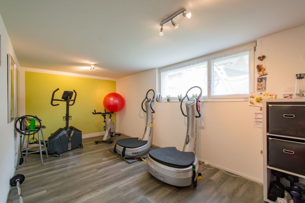 Der Zugang zum Haus erfolgt über die Ebene 0. Auf diesem Stockwerk befindet sich ausserdem ein Gästezimmer, Dusche/WC, der Heiz- und Waschraum sowie ein weiteres Zimmer, welches derzeit als Fitnessraum genutzt wird. Auf diesem Niveau befinden sich auch die Doppelgarage mit Abstellflächen für Geräte.