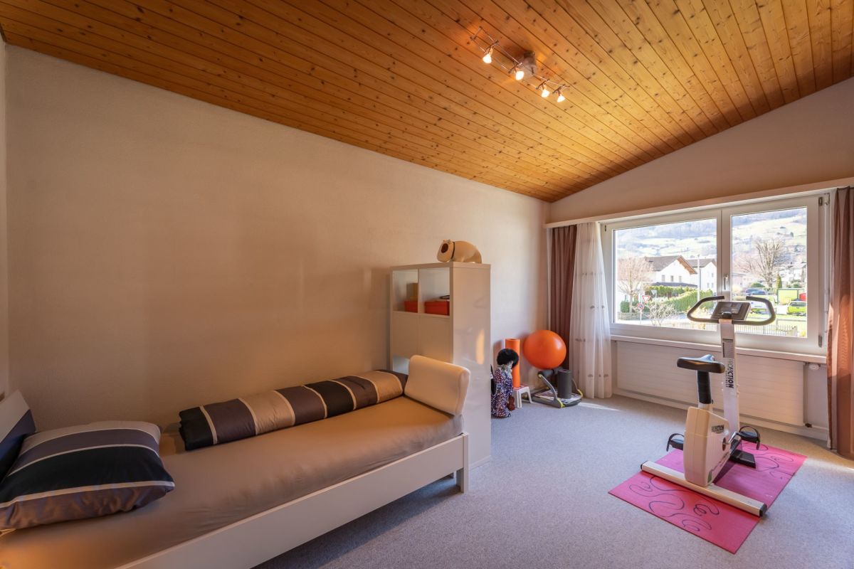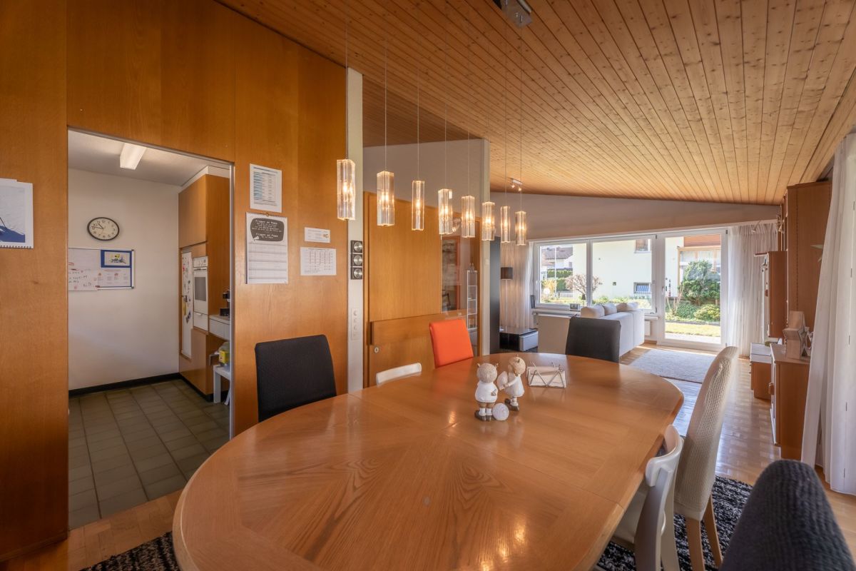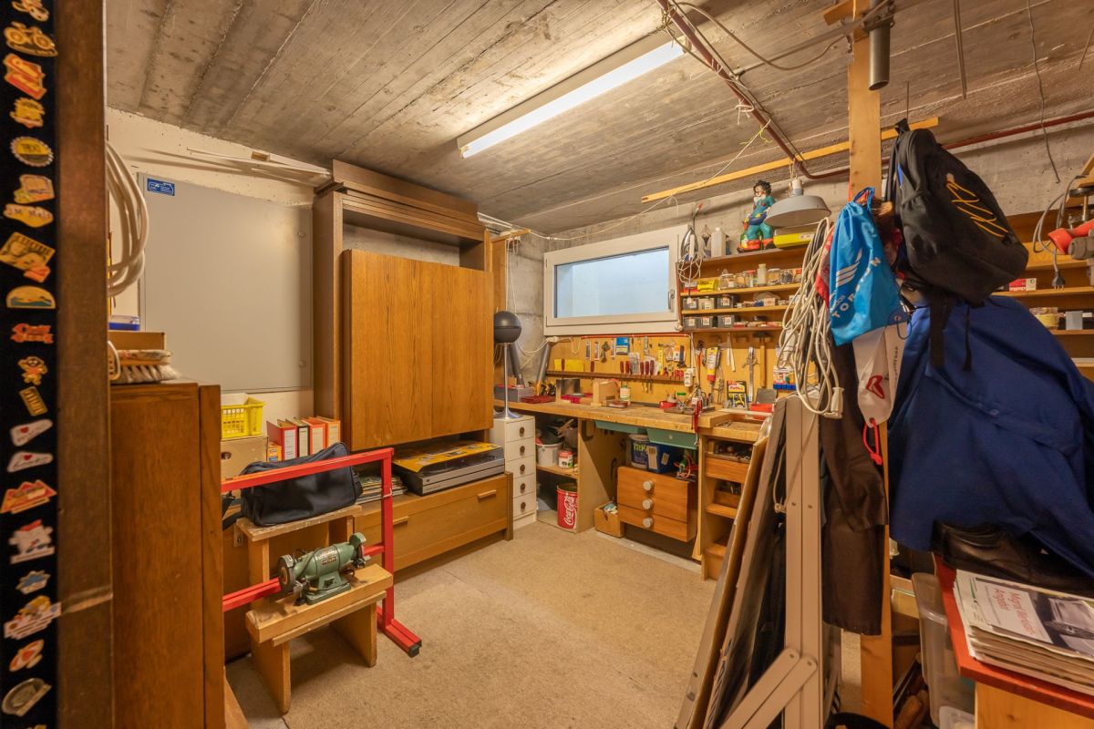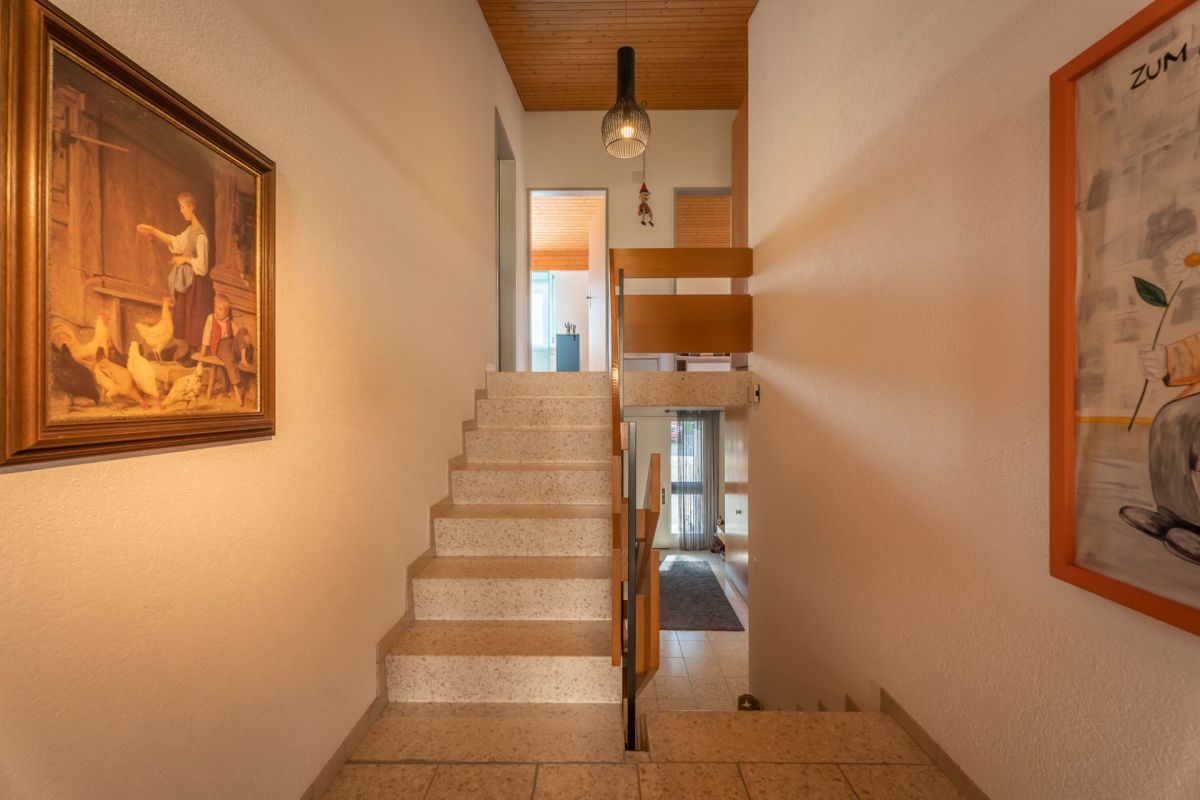 Das Gebäude ist in einer Splitlevel-Bauweise erstellt, das heisst, die verschiedenen Ebenen liegen jeweils ein halbes Stockwerk versetzt zueinenander. Zum Kellergeschoss gehören Werkstatt, Heizung, Tankraum, Luftschutzraum und Keller. Ein Gästezimmer, eine Nasszelle mit Dusche/WC, das Entrée und die Einzelgarage befinden sich im Erdgeschoss. Das Wohngeschoss punktet mit einem grosszügigen Wohn-/Essbereich mit Zugang zum Sitzplatz sowie einer geschlossenen Küche. Das Schlafgeschoss setzt sich aus drei Schlafzimmern und einem Badezimmer (Bad/WC) zusammen.