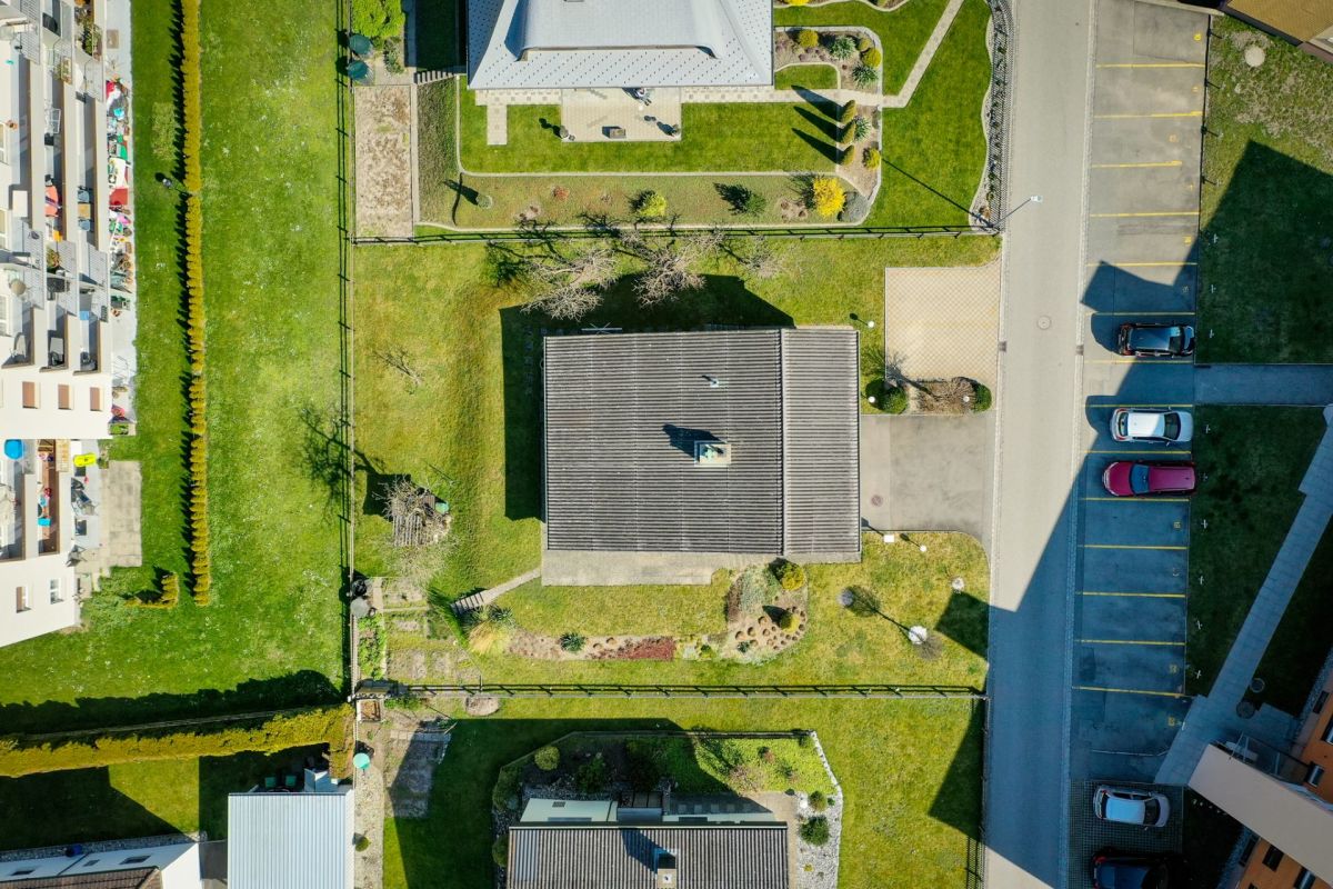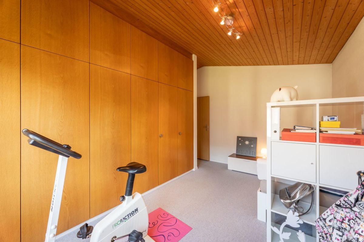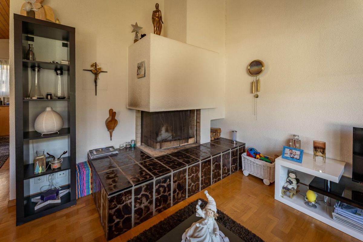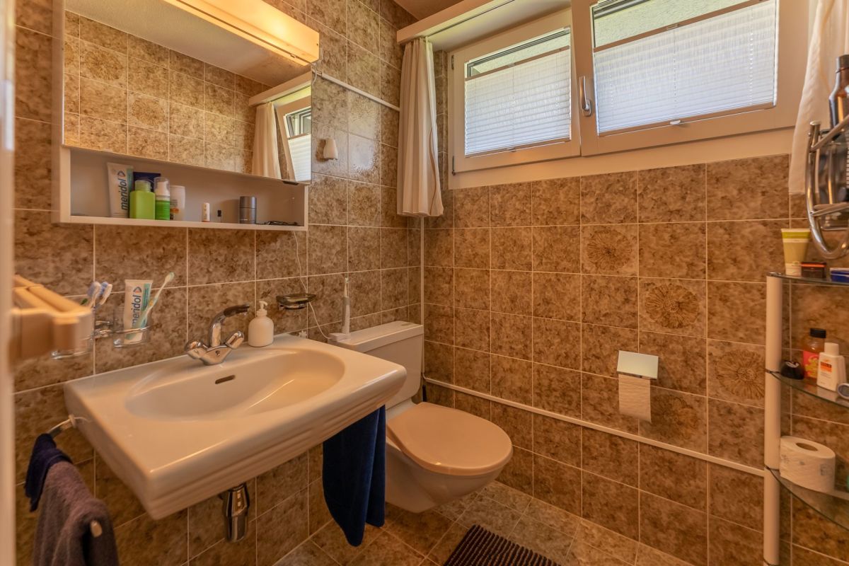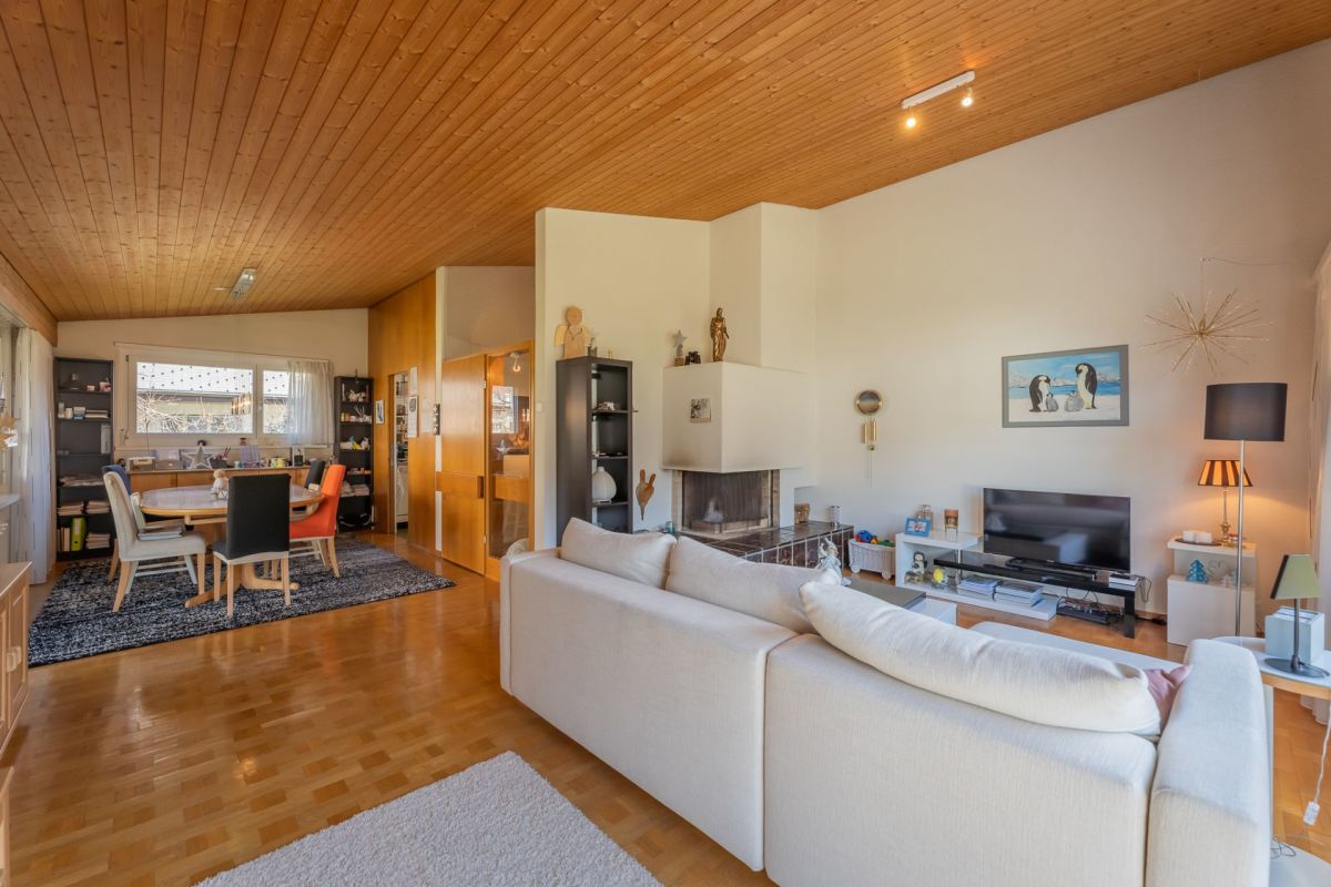Das Gebäude ist in einer Splitlevel-Bauweise erstellt, das heisst, die verschiedenen Ebenen liegen jeweils ein halbes Stockwerk versetzt zueinenander. Zum Kellergeschoss gehören Werkstatt, Heizung, Tankraum, Luftschutzraum und Keller. Ein Gästezimmer, eine Nasszelle mit Dusche/WC, das Entrée und die Einzelgarage befinden sich im Erdgeschoss. Das Wohngeschoss punktet mit einem grosszügigen Wohn-/Essbereich mit Zugang zum Sitzplatz sowie einer geschlossenen Küche. Das Schlafgeschoss setzt sich aus drei Schlafzimmern und einem Badezimmer (Bad/WC) zusammen.