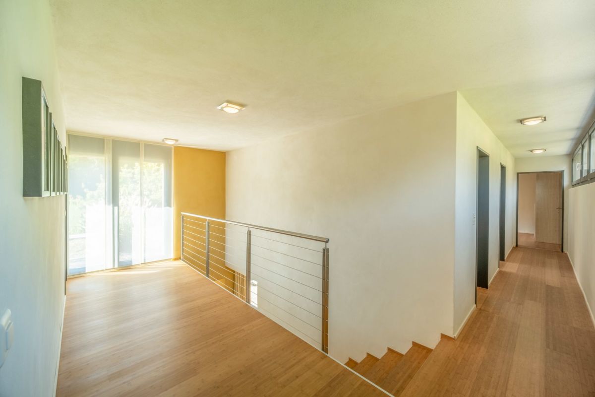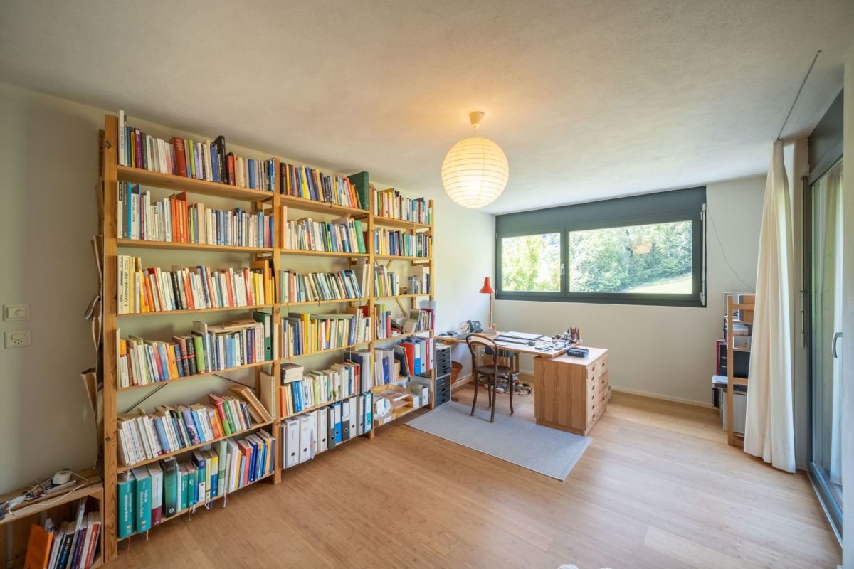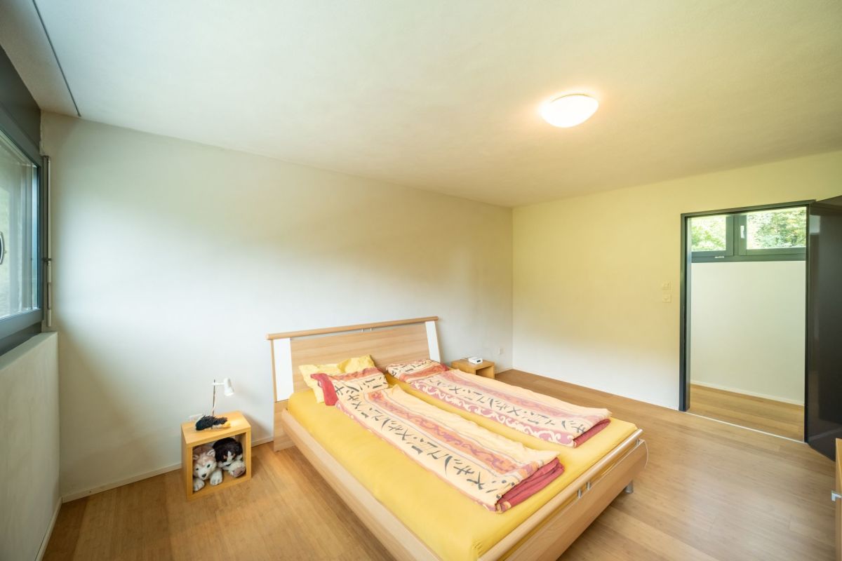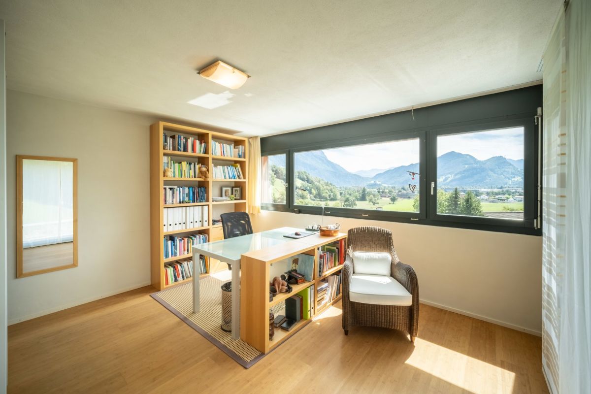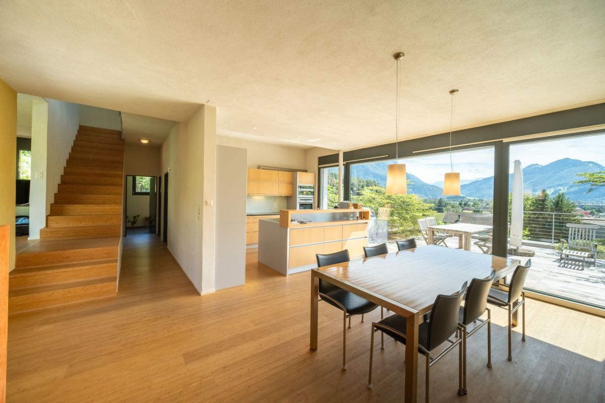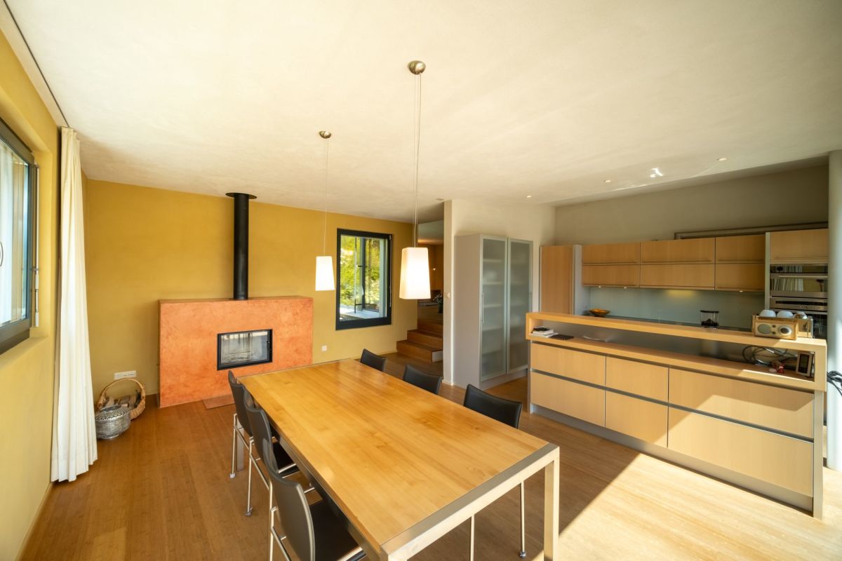 Im Erdgeschoss befindet sich der Koch- und Essbereich, von welchem Sie eine freie Sicht in die Umgebung geniessen. Die Aussichtsterrasse vor dem Essbereich verspricht viel Sonne und ein traumhaftes Panorama sowie erholsame und genüssliche Momente. Drei Stufen erhöht führt ein Durchgang in den grosszügigen, leicht zurückgezogenen Wohnbereich. Der gekieste Innenhof vor dem Wohnzimmer bildet einen geschützten, zum Teil schattigen Rückzugsort im Sommer. Ein Büro, ein Gäste-WC sowie das Entrée runden das Raumangebot im Erdgeschoss ab. Über eine Treppe gelangen Sie ins Obergeschoss, wo drei Schlafzimmer sowie zwei Nasszellen untergebracht sind.