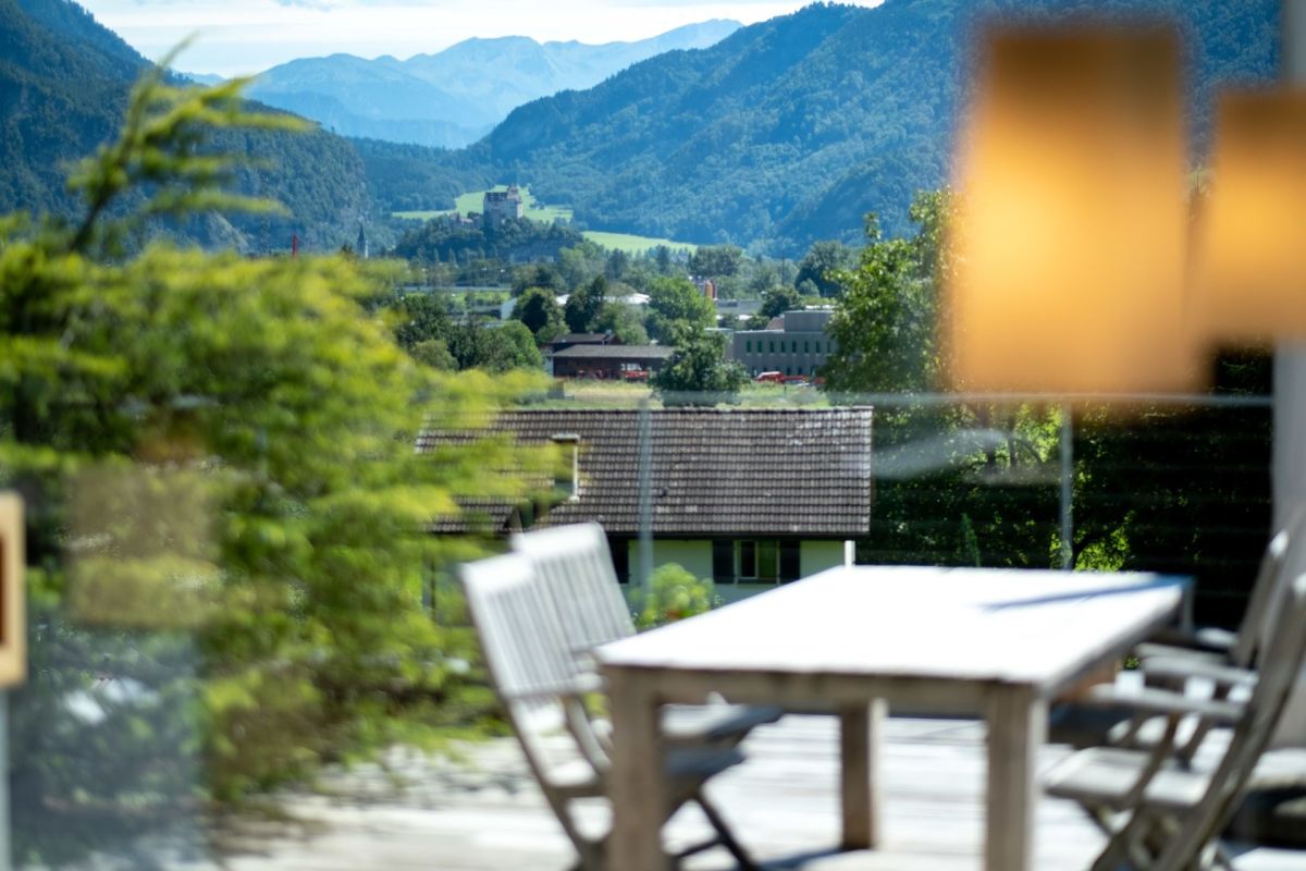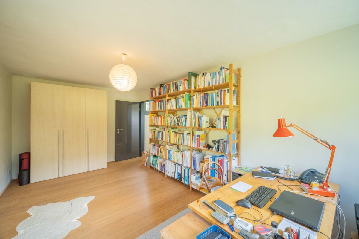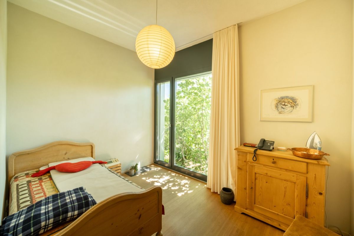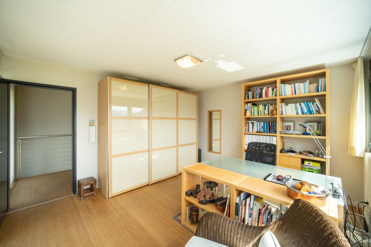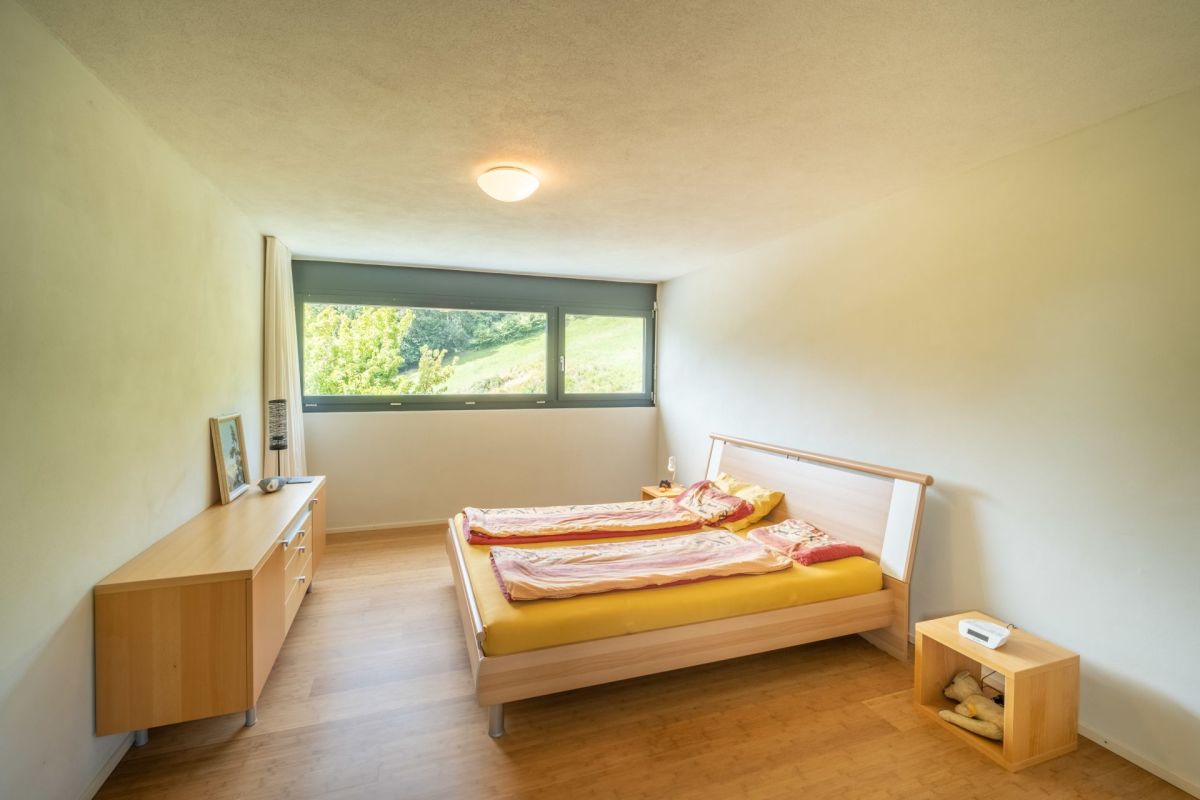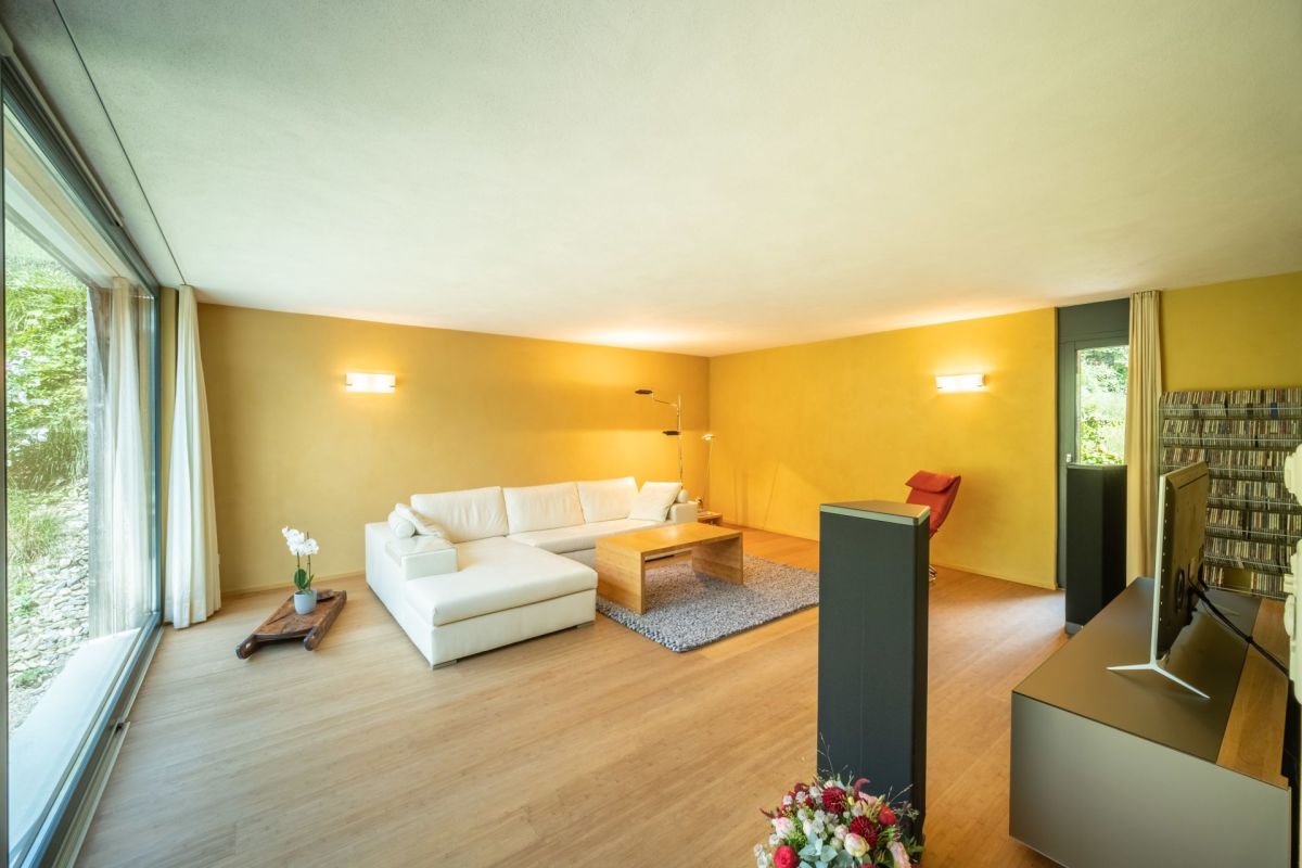 Im Erdgeschoss befindet sich der Koch- und Essbereich, von welchem Sie eine freie Sicht in die Umgebung geniessen. Die Aussichtsterrasse vor dem Essbereich verspricht viel Sonne und ein traumhaftes Panorama sowie erholsame und genüssliche Momente. Drei Stufen erhöht führt ein Durchgang in den grosszügigen, leicht zurückgezogenen Wohnbereich. Der gekieste Innenhof vor dem Wohnzimmer bildet einen geschützten, zum Teil schattigen Rückzugsort im Sommer. Ein Büro, ein Gäste-WC sowie das Entrée runden das Raumangebot im Erdgeschoss ab. Über eine Treppe gelangen Sie ins Obergeschoss, wo drei Schlafzimmer sowie zwei Nasszellen untergebracht sind.