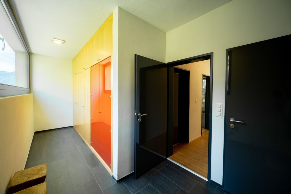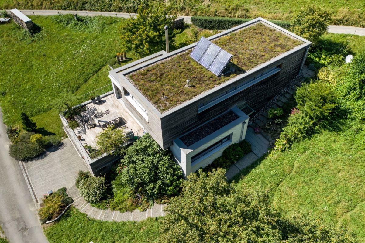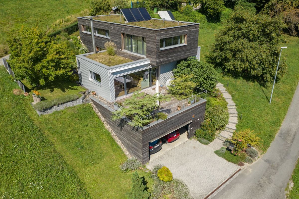 Das Einfamilienhaus wurde im Jahr 2003 im Massivbau mit hinterlüfteter Holz- bzw. Metallfassade erstellt. Die Mauerwerke innen sind mit Lehmputz überzogen und sorgen für ein optimales Raumklima. In den Wohn- und Schlafbereichen wurde ein hochwertiger Bambusparkett verlegt. Das Heizsystem, bestehend aus Erdsonden-Wärmepumpe und Sonnenkollektoren auf dem Dach, sorgt für eine umweltschonende und nachhaltige Wärmeerzeugung.